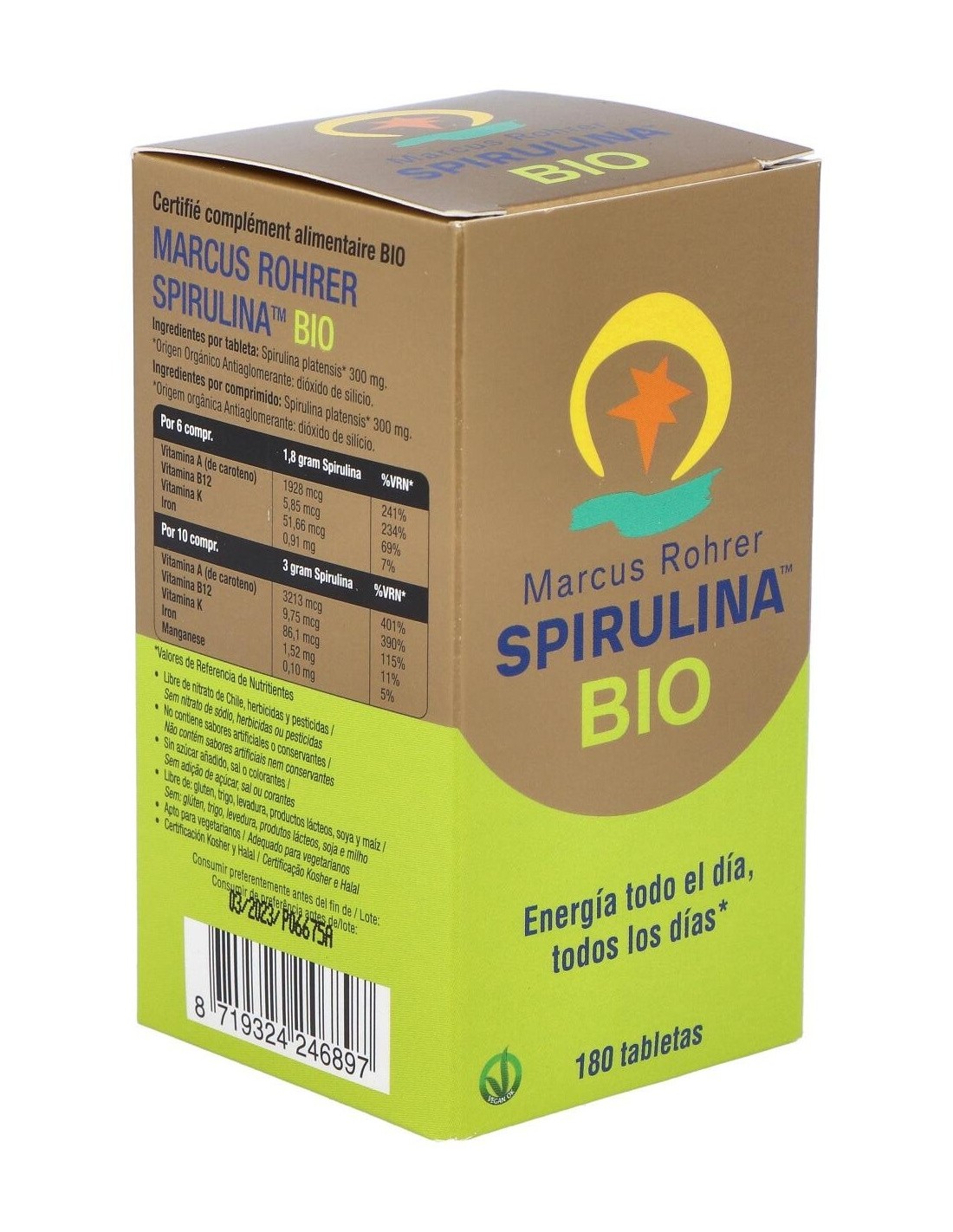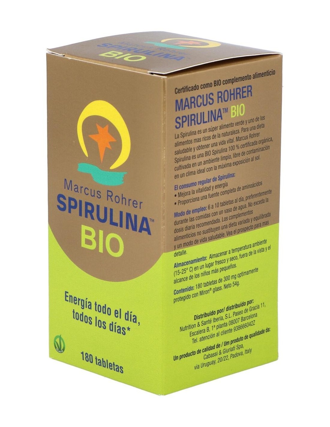 Los comprimidos de spirulina se elaboran siguiendo el siguiente proceso: se secan las algas a baja temperatura tan pronto se han cosechado, manteniendo intactas todas sus propiedades. Se prensa el polvo en forma de tabletas y cápsulas. La Spirulina de Marcus Rohrer® no contiene ningún tipo de conservante o colorante o pesticida, con lo que se garantiza su frescura y pureza. La spirulina es un alga de color azul verdoso que tiene forma de espiral y crece originariamente en zonas subtropicales. La spirulina de Marcus Rohrer crece en una granja acuática especial en la isla de Hawaii, bajo radiación solar intensa. Condiciones ideales para esta alga que transforma la luz solar en nutrientes y energía. Esta fuente vital de energía es muy sensible y se deteriora rápidamente dentro de un envase ordinario de materia plástica o vidrio. Esta es la razón por la que la Spirulina de Marcus Rohrer está envasada dentro de un vidrio especial VioSol, un descubrimiento revolucionario que protege la calidad y conserva el valor bioenergético de Spirulina a un nivel óptimo. La luz violeta pura del vidrio VioSol vitaliza y conserva la energía de las moléculas de la Spirulina de forma continua, favoreciendo la fuerza vital del producto y manteniéndolo fresco durante mucho más tiempo. La espirulina es una diminuta alga que crece de forma natural en el subtrópico de Méjico y África Central, idónea para aquellos que llevan una vida activa y agotadora. Es una fuente natural de: