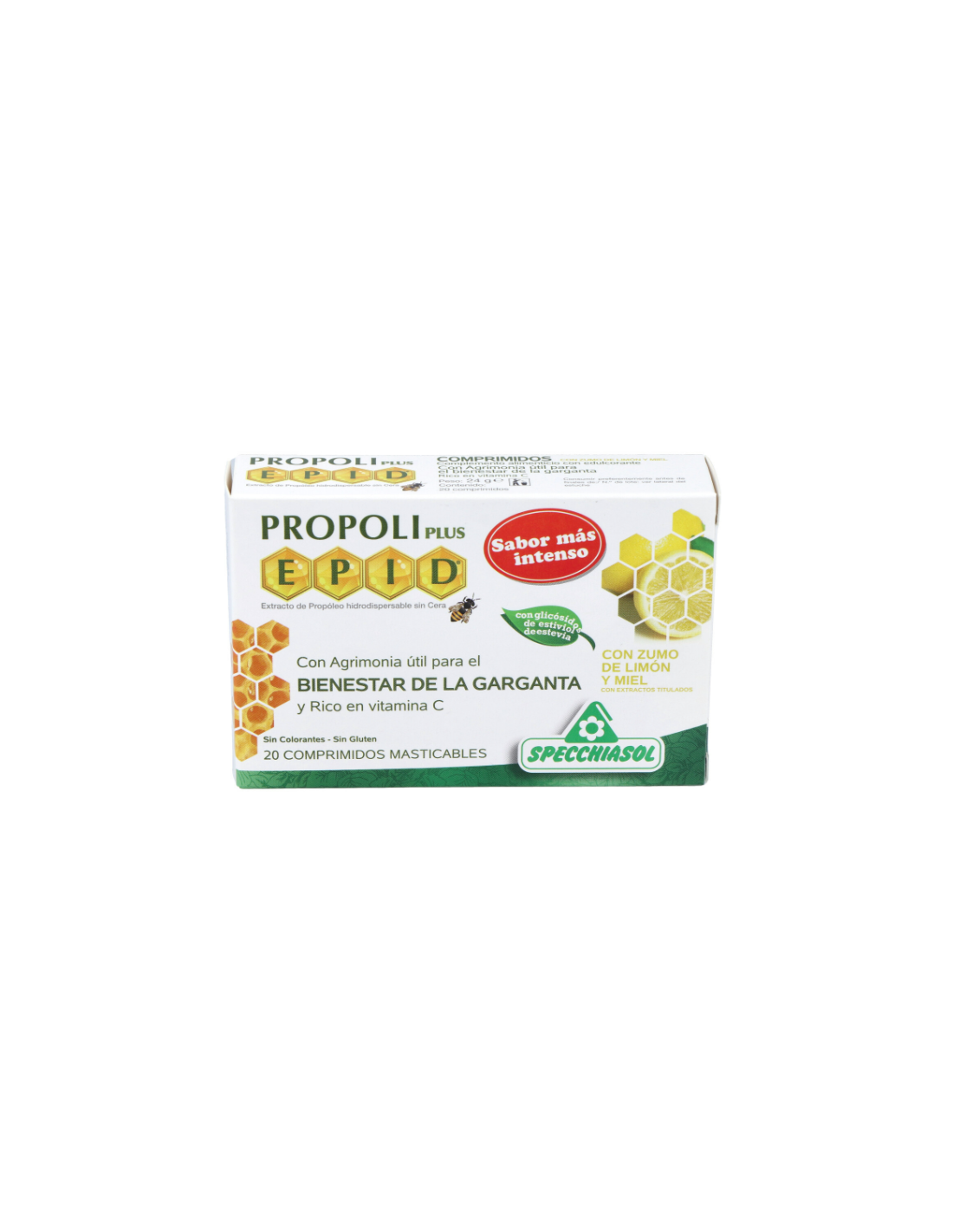 Extracto seco de Propóleo E.P.I.D.®, Rosa canina e.s., Agrimonia e.s. Zumo de limón y miel. Con edulcorante.