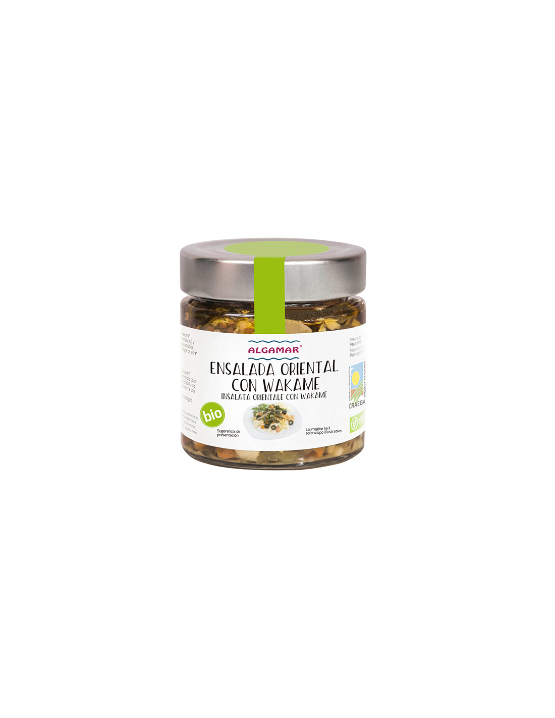 Ensalada oriental con Wakame para consumir algas en la alimentación diaria, ya que es ideal como guarnición o acompañante de recetas. Lista para comer: como guarnición y acompañante para ensaladas, bocadillos, tostadas, verduras, patatas, pasta, arroz, tofu, seitán, etc.