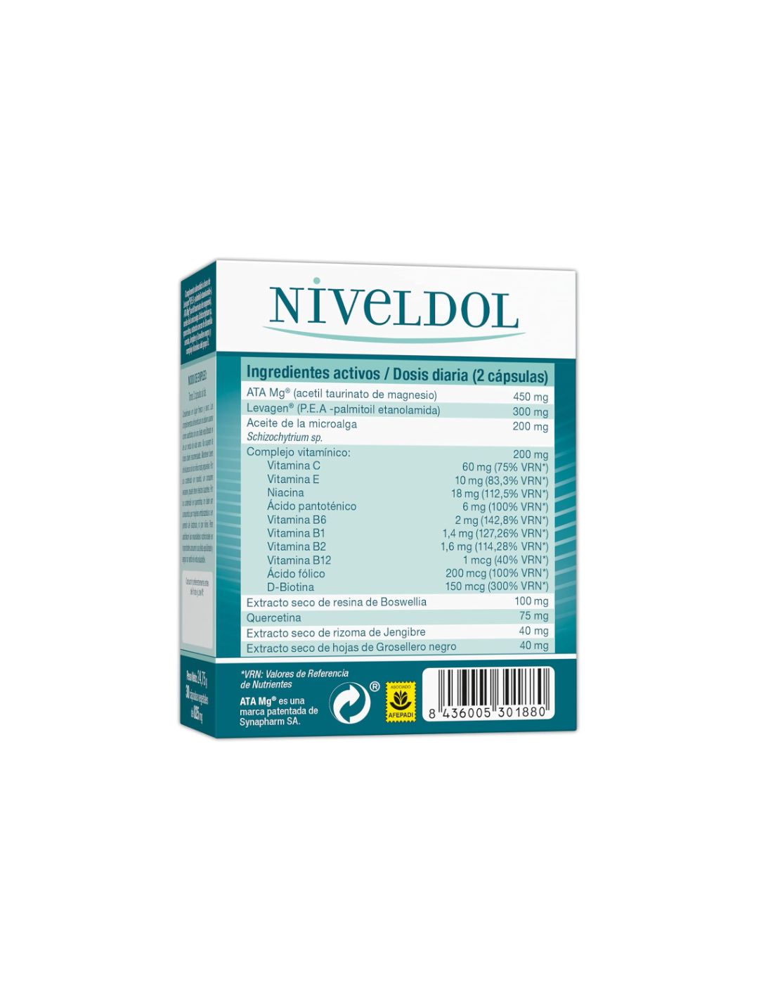Complemento alimenticio a base de Levagen® (P.E.A -palmitoil etanolamida-), ATA Mg® (acetil taurinato de magnesio), aceite de la microalga Schizochytrium sp., quercetina, extractos secos de Boswellia serrata, Jengibre y Grosellero negro, y complejo vitamínico del grupo B.