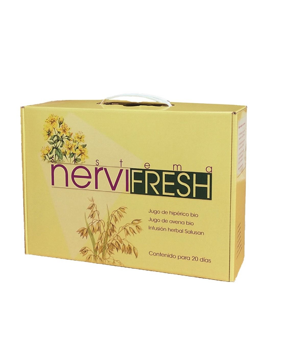 Sistema Nervifresh de Salus es un programa de 20 días que se compone de 3 productos (1 unidad de Jugo de Avena Bio, 1 unidad de Jugo de Hipérico Bio y