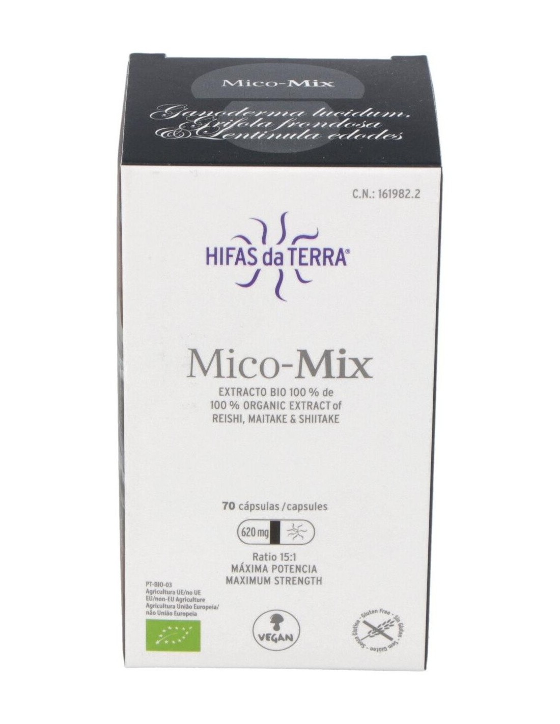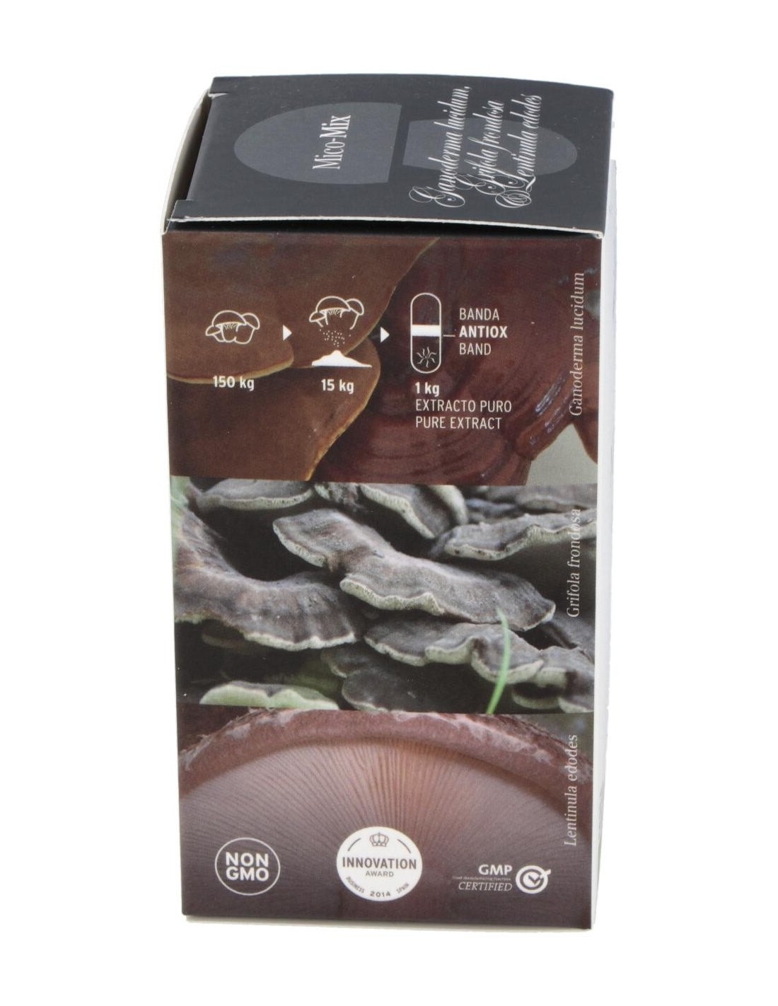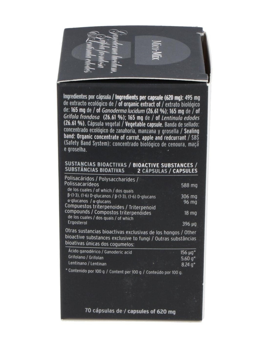 Mico Mix Extracto de 3 hongos medicinales es un complemento alimenticio de alta concentración en cápsulas. Solo contiene extracto puro y ecológico de Reishi, Maitake y Shiitake. Esta sinergia de extractos tiene un alto contenido de nutrientes como beta-glucanos, vitaminas, aminoácidos esenciales, etc. Con el fin de preservar las cualidades de nuestros extractos, sellamos cada cápsula con una banda antioxidación.Lentinula edodes Lentinula edodes, hongo nativo del Este del continente asiático. Esta especie ha sido cultivado en la antigua China e integrado desde hace siglos en la alimentación Japonesa. Su nombre deriva de Shii (una variedad de castaño) y Take (hongo) ya que crece de forma espontánea sobre troncos muertos de estos árboles. Se caracteriza por formar setas cuyo sombrero oscila entre tonos marrones y dorados. Sobre el sombrero suele tener un moteado de color gris oscuro. El pie es robusto y presenta un color más claro. Ganoderma lucidumReishi, Ganoderma lucidum, es uno de los hongos más empleados en la Medicina Tradicional China (MTC) junto con otras especies como Shiitake y Maitake. Este hongo, de la familia de las ganodermatáceas, se puede encontrar sobre troncos de madera de roble, pero precisamente no se considera un buen comestible por su sabor amargo y su consistencia leñosa. Su sombrero, de forma arriñonada y con tonos rojizos y negros, le otorgan un aspecto lúcido, característica definida en su nombre científico. En Oriente es conocido como hongo de la inmortalidad y de acuerdo con distintos documentos, empezó a emplearse en China hace más de 4.000 años. Además, ha sido reconocido entre las 10 Sustancias Terapéuticas más Eficaces. Se trata de una variedad adaptógena, esto es, posee la cualidad de ayudar a un organismo a adaptarse a su entorno. Grifola frondosaMaitake, Grifola frondosa, crece sobre todo en otoño sobre tocones de robles, castaños y hayas. Desarrolla un carpóforo poroso y ramificado en tonos grises-acastañados. Es un hongo cosmopolita pero principalmente conocido y utilizado en Japón.Según la tradición el nombre hongo danzante deriva del hecho que antiguamente el que encontraba este hongo bailaba alegremente por que lo podía cambiar por su peso en oro. Composición activa por cápsula: