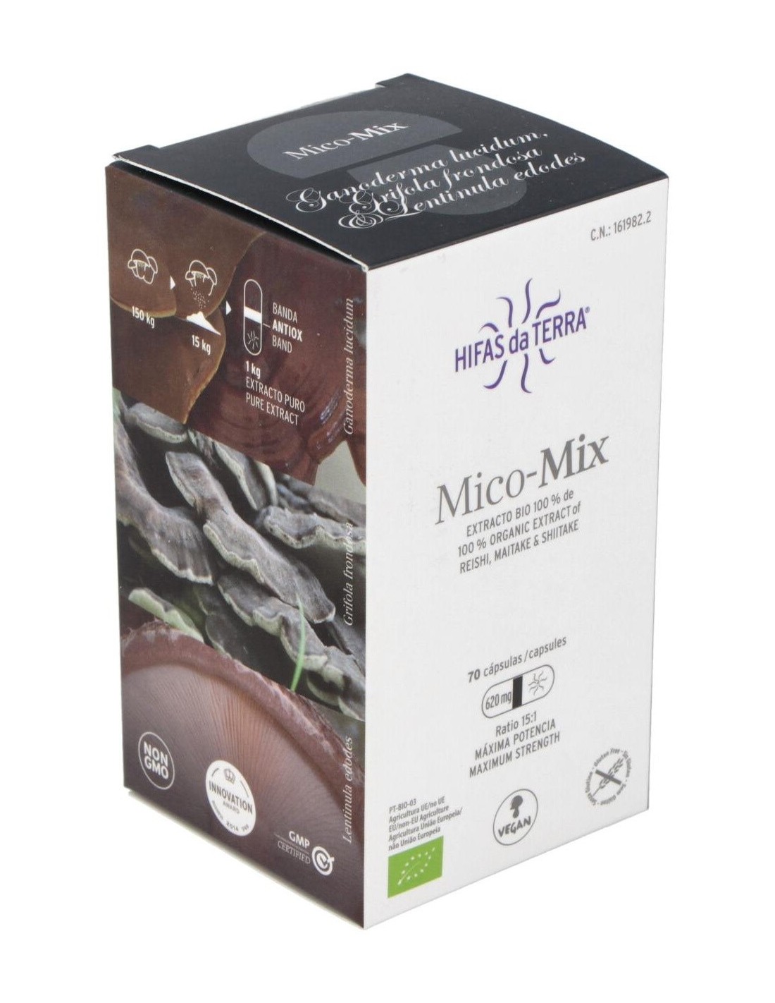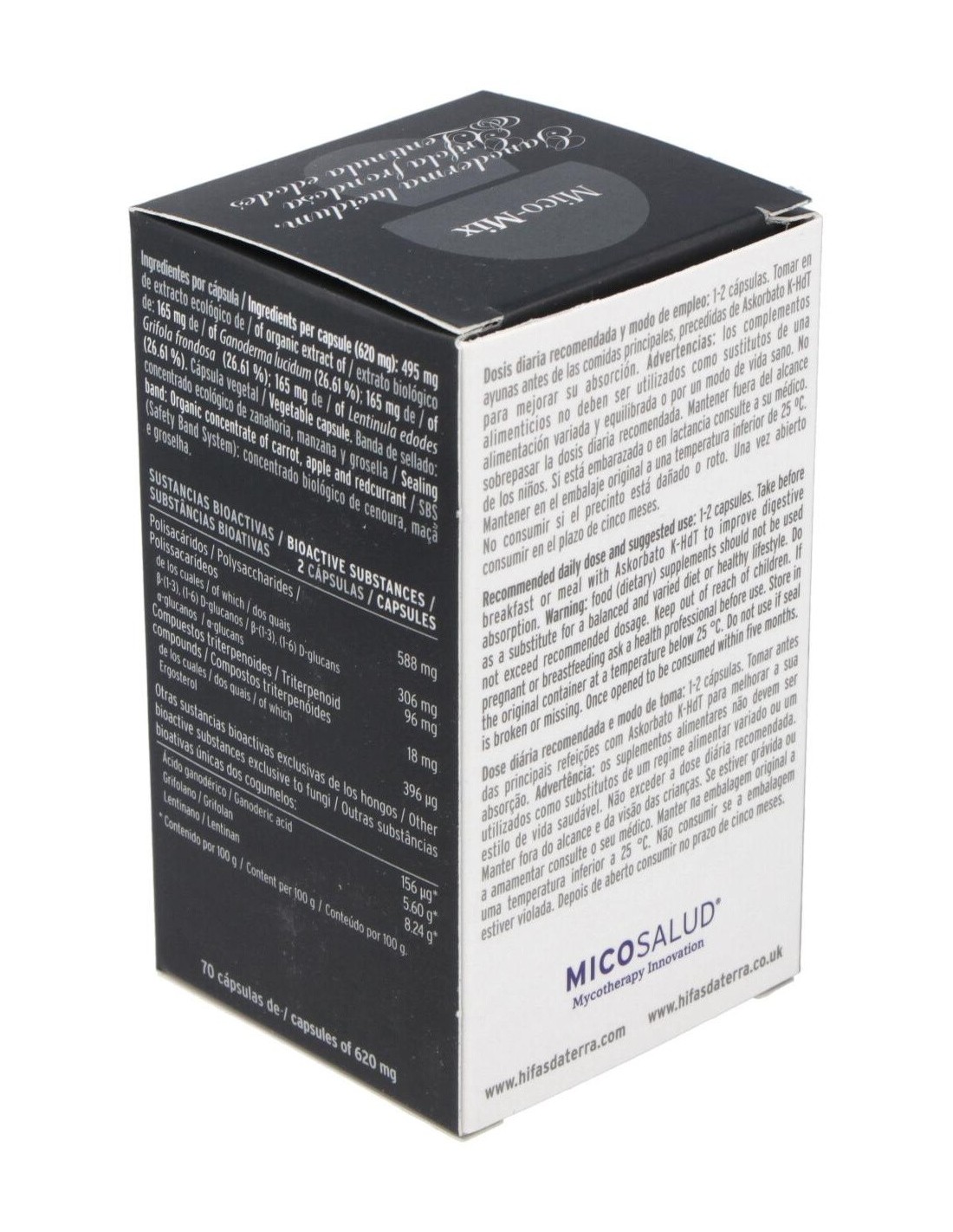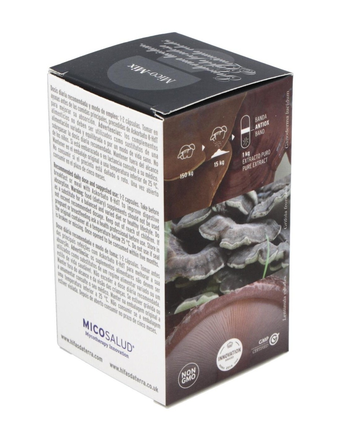 Mico Mix Extracto de 3 hongos medicinales es un complemento alimenticio de alta concentración en cápsulas. Solo contiene extracto puro y ecológico de Reishi, Maitake y Shiitake. Esta sinergia de extractos tiene un alto contenido de nutrientes como beta-glucanos, vitaminas, aminoácidos esenciales, etc. Con el fin de preservar las cualidades de nuestros extractos, sellamos cada cápsula con una banda antioxidación.Lentinula edodes Lentinula edodes, hongo nativo del Este del continente asiático. Esta especie ha sido cultivado en la antigua China e integrado desde hace siglos en la alimentación Japonesa. Su nombre deriva de Shii (una variedad de castaño) y Take (hongo) ya que crece de forma espontánea sobre troncos muertos de estos árboles. Se caracteriza por formar setas cuyo sombrero oscila entre tonos marrones y dorados. Sobre el sombrero suele tener un moteado de color gris oscuro. El pie es robusto y presenta un color más claro. Ganoderma lucidumReishi, Ganoderma lucidum, es uno de los hongos más empleados en la Medicina Tradicional China (MTC) junto con otras especies como Shiitake y Maitake. Este hongo, de la familia de las ganodermatáceas, se puede encontrar sobre troncos de madera de roble, pero precisamente no se considera un buen comestible por su sabor amargo y su consistencia leñosa. Su sombrero, de forma arriñonada y con tonos rojizos y negros, le otorgan un aspecto lúcido, característica definida en su nombre científico. En Oriente es conocido como hongo de la inmortalidad y de acuerdo con distintos documentos, empezó a emplearse en China hace más de 4.000 años. Además, ha sido reconocido entre las 10 Sustancias Terapéuticas más Eficaces. Se trata de una variedad adaptógena, esto es, posee la cualidad de ayudar a un organismo a adaptarse a su entorno. Grifola frondosaMaitake, Grifola frondosa, crece sobre todo en otoño sobre tocones de robles, castaños y hayas. Desarrolla un carpóforo poroso y ramificado en tonos grises-acastañados. Es un hongo cosmopolita pero principalmente conocido y utilizado en Japón.Según la tradición el nombre hongo danzante deriva del hecho que antiguamente el que encontraba este hongo bailaba alegremente por que lo podía cambiar por su peso en oro. Composición activa por cápsula: