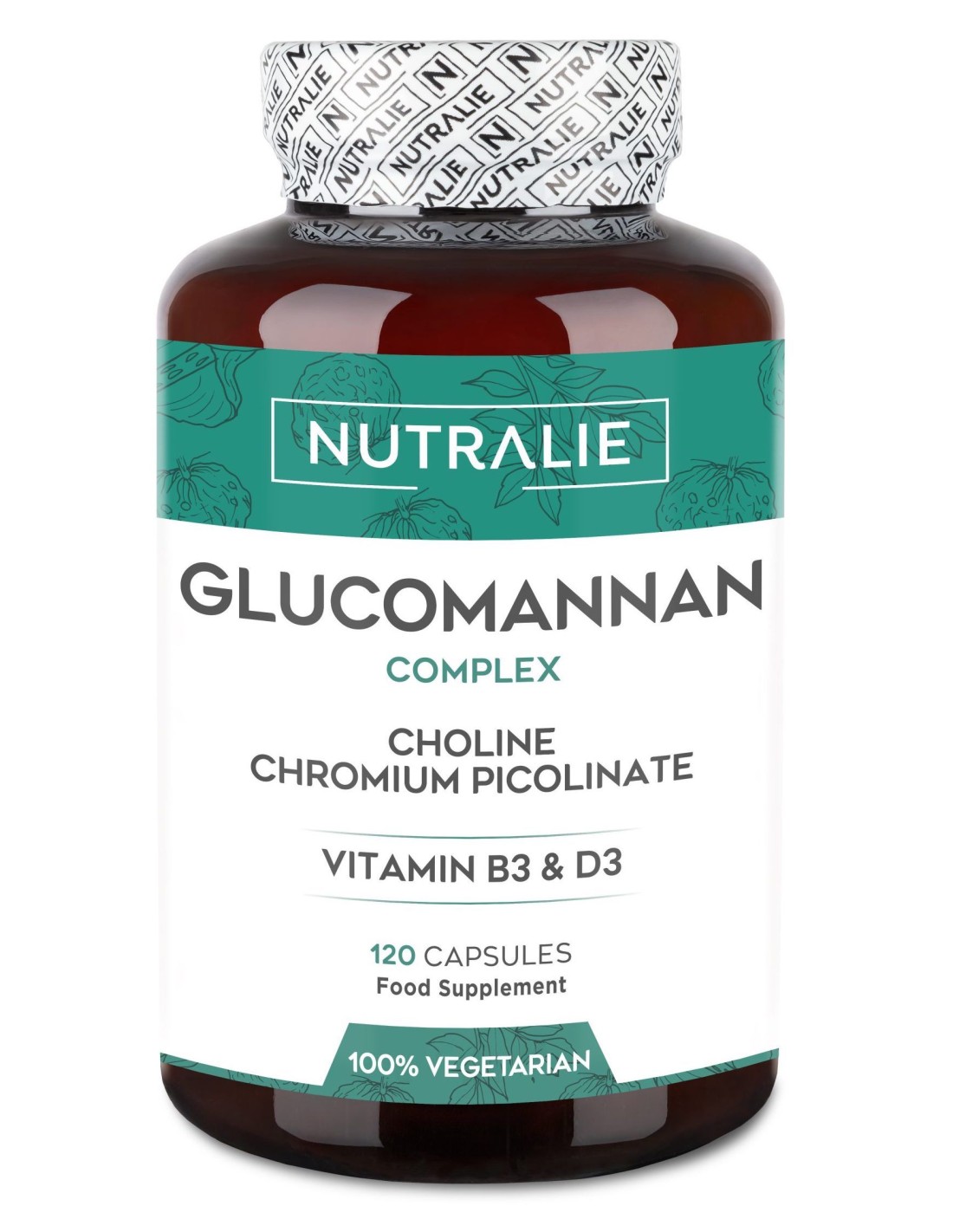 Glucomanano Complex, ayuda a adelgazar cuando se sigue una dieta baja en calorías, además contribuye a mantener niveles normales de colesterol sanguíneo. El complemento alimenticio Glucomanano Complex combina la fibra vegetal del glucomanano de Konjac, propia de Asia, con bitartrato de colina, picolinato de cromo y vitaminas B3 y D3.Poder adelgazar cuando se sigue una dieta baja en calorías, es un efecto beneficioso que se obtiene por una una ingesta diaria de 3 g de glucomanano (en tres dosis de 1 g) antes de cada comida. Nuestro Glucomanano Complex contiene glucomanano de Konjac, siendo el complemento alimenticio ideal para aquellas personas que quieren obtener este efecto beneficioso.El Glucomanano Complex está dirigido a personas que mantienen un estilo de vida saludable y siguen una dieta baja en calorías (dieta keto), ya que el glucomanano de Konjac ayuda a adelgazar cuando se sigue una dieta baja en calorías.Composición activa por 5 cápsulas: