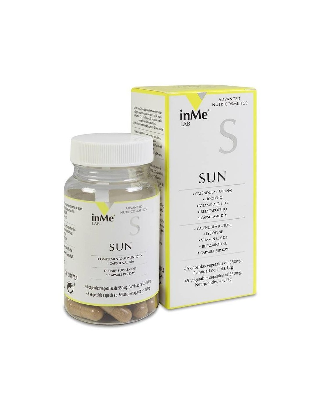 Esta fórmula Inme SUN está diseñada para dar apoyo a la piel expuesta al sol por su contenido en betacaroteno, un precursor natural de la Vitamina A, que contribuye a la distribución uniforme de melanina en la piel, licopeno, el cual ayuda a proteger a las células del daño oxidativo, y vitaminas C, E y D3, que contribuyen a mantener el sistema inmunitario en condiciones normales y protegen frente al daño oxidativo de los radicales libres.