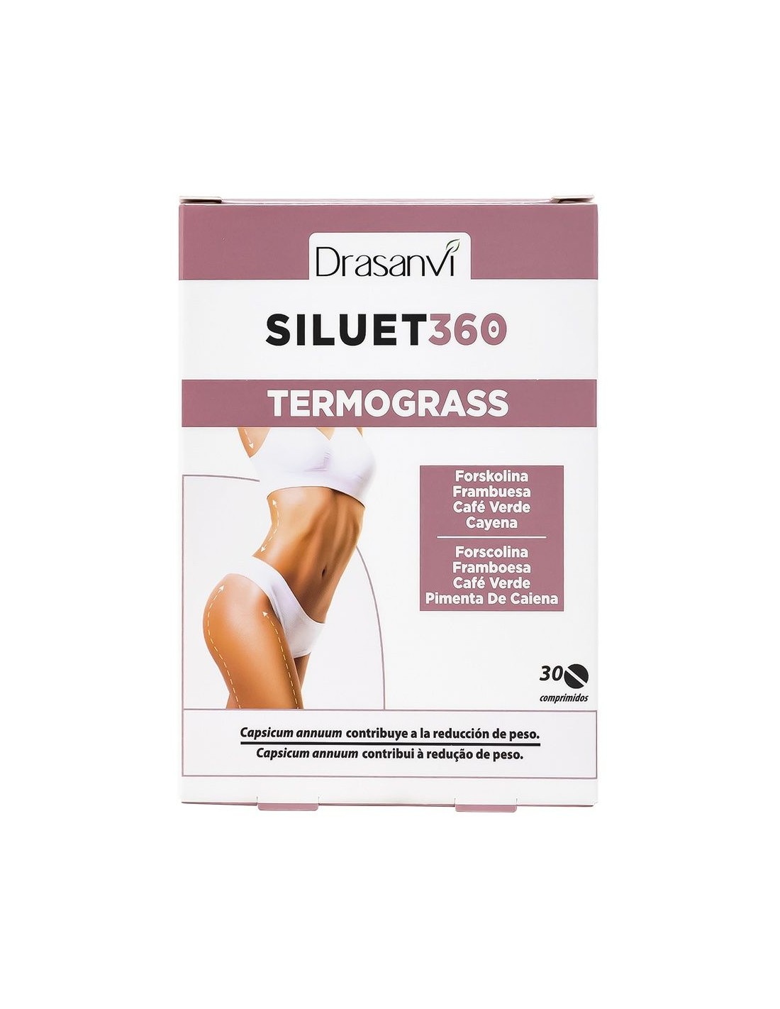 Siluet 360 - Termograss de Drasanvi es un complemento alimenticio que ayudar a aumentar el metabolismo. Compuesto a base de plantas y minerales que contribuye a una mayor pérdida de grasa. Contiene extractos secos de cayena, coleus, frambuesa y café verde, además de componentes como la L-carnitina y picolinato de cromo.Dirigido a personas con sobrepeso y obesidad que quieran perder, concretamente, grasa corporal. Está indicado también para personas con síndrome metabólico (hipotiroidismo) ya que en el caso de esta enfermedad no son muchos los suplementos alimenticios que puedan ser consumidos por ellos. También para personas con azúcar alto (incluso pacientes que tienen una diabetes controlada). Puede ser de ayuda a personas que tengan poco gasto calórico y/o sedentarias.Principios activos: