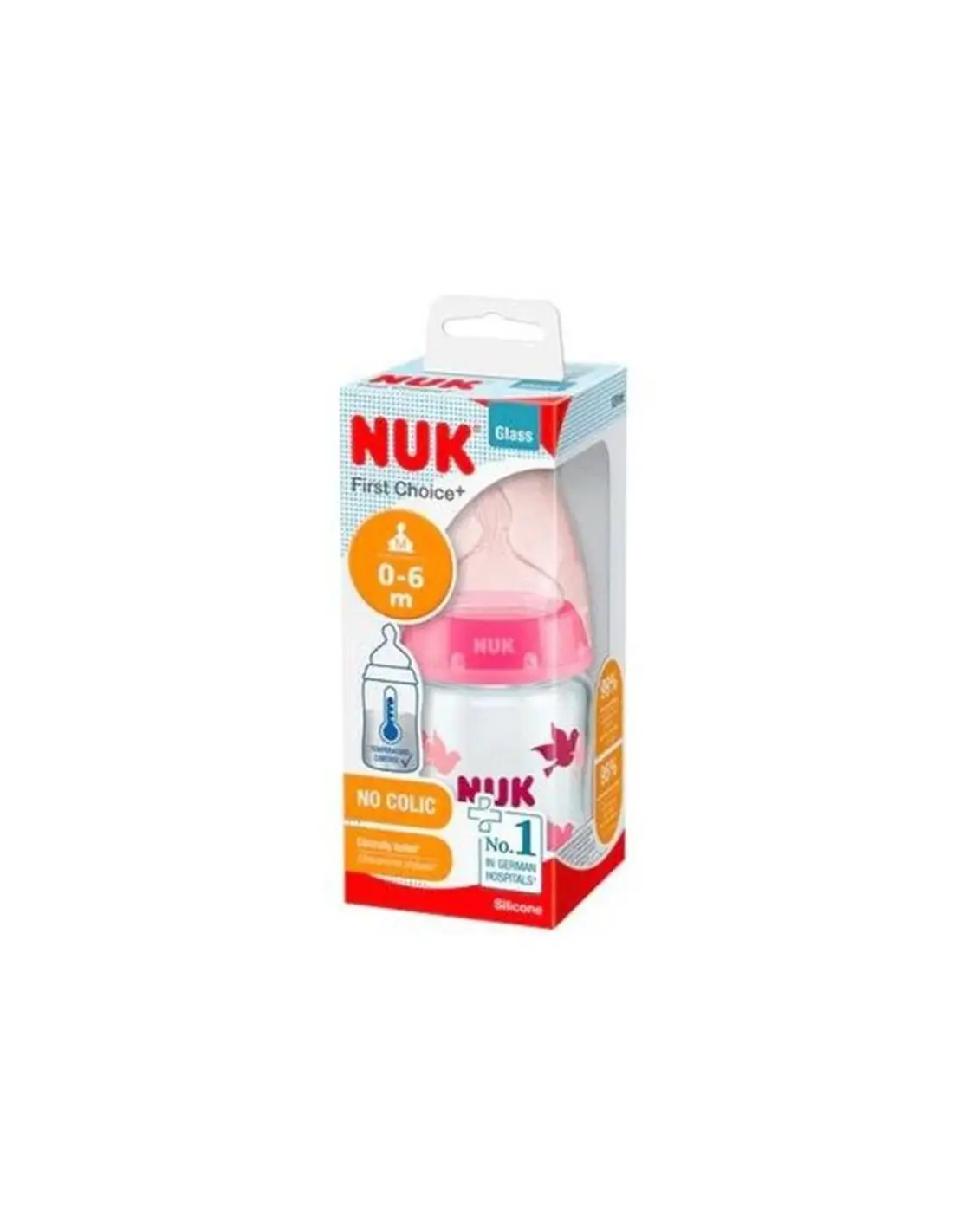 Higiénico, con el aspecto de alta calidad del vidrio y cómodo de sujetar.\ No contiene sustancias nocivas; sin olor y sin BPA.\ Cuello ancho para facilitar el llenado y la limpieza.\ Medidas y tallas disponibles: 0-6m (orificio M)\ Con sistema de ventilación NUK ANTI-COLIC AIR SYSTEM mejorado que ayuda a prevenir los cólicos.\ Incluye anillo de rosca, disco de cierre y tapa protectora.\ Diseño y variadedad de colores según disponibilidad.\ Capacidad 120ml.\ Disponible en silicona\ \ *El color y diseño de la imagen, pueden cambiar.