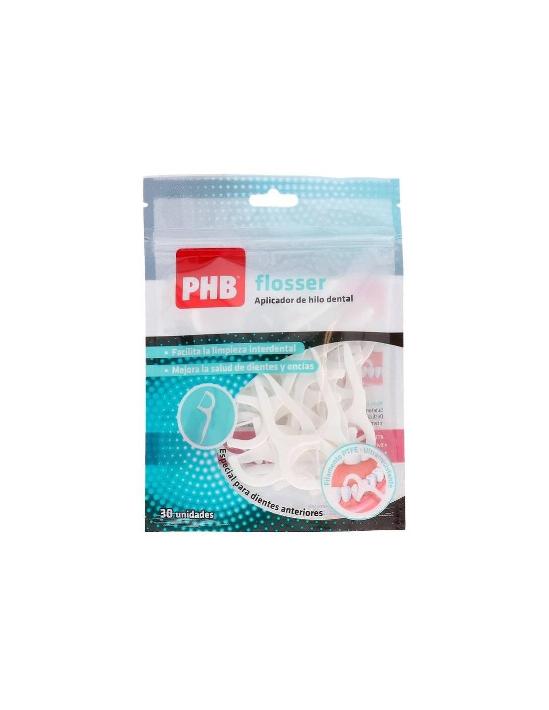 PHB flosser es un aplicador de hilo dental diseñado para:\ Facilitar la limpieza interdental\ Ayudar a mejorarla salud de dientes y encías\ Cabezal de monofilamento de PTFE fácil de usar que no se deshilacha entre los dientes.\ Especialmente indicado para dientes anteriores.