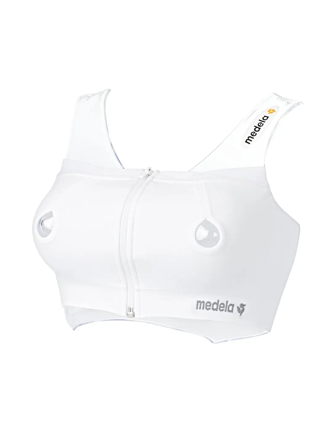 El top de extracción Hands-free de Medela hace que la extracción de leche sea fácil y práctica. Tanto el extractor de leche como embudos quedan bien sujetados.