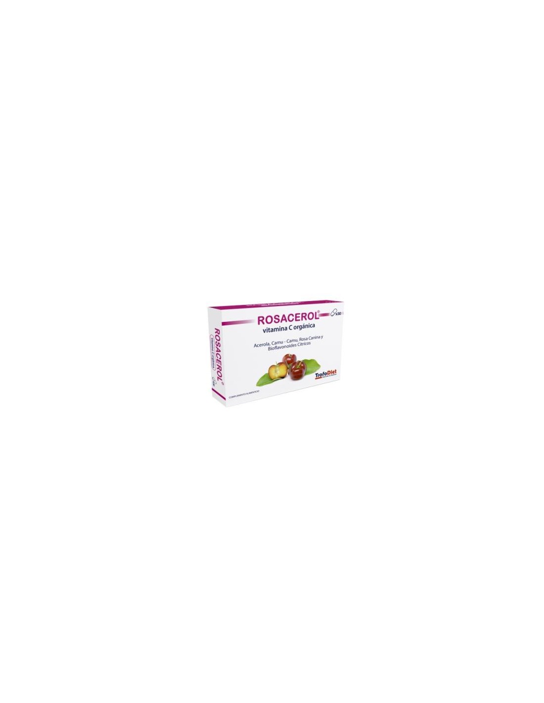 Rosacerol es un producto 100 % natural que proporciona la dosis diaria recomendada de Vitamina C orgánica junto a las otras sustancias presentes de forma natural en el extracto de Acerola, Camu - Camu, Rosa Canina y Bioflavonoides cítricos. Estas sustancias contribuyen a una biodisponibilidad ideal de la Vitamina C y completan su poder antioxidante. La Vitamina C contribuye al funcionamiento normal del sistema inmunitario, a disminuir el cansancio y la fatiga, a la protección de las células frente al daño oxidativo y al funcionamiento normal del sistema nervioso.