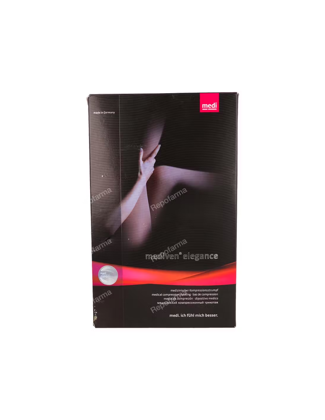 MEDIVEN PLUS AG es una media de compresión médica de punto circular con un aspecto opaco. Disimula las venas varicosas y las arañas vasculares y es cómodo de llevar incluso con muslos fuertes.