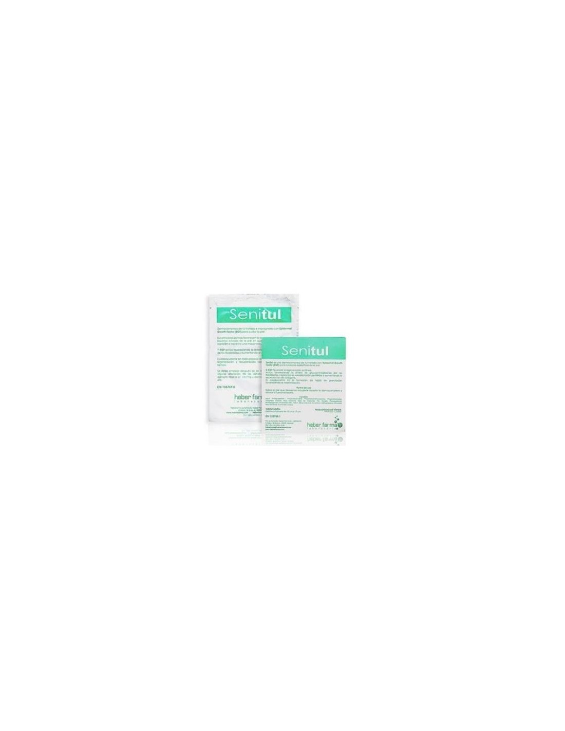 Apósito impregnado para regenerar la piel. El principal ingrediente de Senitul es el FCE (Factor de Crecimiento Epidérmico), proteína que favorece la regeneración debido a una serie de reacciones que se producen en dermis y epidermis. El FCE relanza el proceso de cicatrización en las heridas crónicas debido a que promueve un efecto antioxidante por estímulo del sistema SOD. Favorece la proliferación de fibroblastos y queratinocitos así como el aumento de la síntesis de colágeno y elastina, sustancias estas fundamentales en la regeneración de los tejidos. Acelera, por tanto, la renovación celular epidérmica. El uso de Senitul está especialmente indicado para quemaduras y dermoabrasiones, heridas traumáticas, después de peeling, laserterapia, llagas por decubito