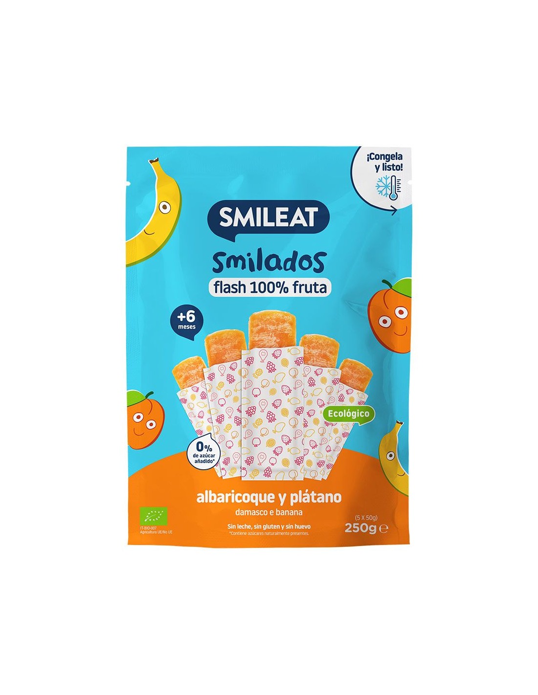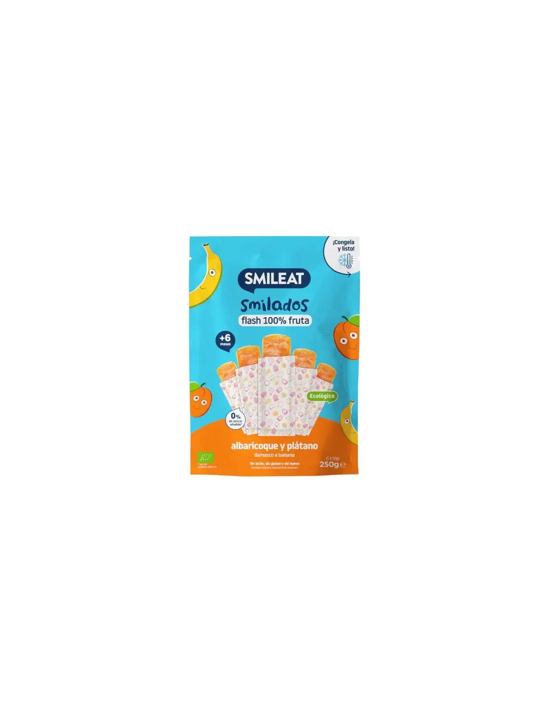 Nos gusta innovar y cuidar de los más pequeños. Por eso, os traemos los Smilados hechos a base de puré de fruta que, al congelar, se transforma en algo parecido al "flash". Fácil de tomar con o sin ayuda ya que deshace fácilmente en la boca. Simulado es el nuevo snack en tu congelador.Ingredientes:Puré de albaricoque* (50%), puré de plátano* (35%), mosto de uva concentrado* (15%). (*) Procedente de agricultura ecológica.Valor nutricional por 100 gramos:
