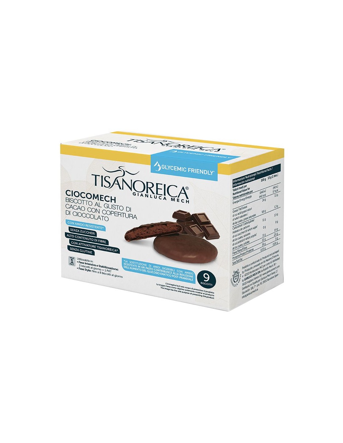 Ingredientes:Mezcla de proteínas: (aislado de proteína de soja NO GMO, colágeno hidrolizado (gelatina comestible), proteína de suero concentrada), cobertura de chocolate 30%: (masa de cacao, edulcorante: maltitol, manteca de cacao, emulgente: lecitina de soja, aroma natural de vainilla), extra- aceite de oliva virgen, polidextrosa, huevo, cacao en polvo 5%, fibras vegetales, almidón resistente (mínimo 20% del total de almidones), espesante: harina de semillas de algarroba, gasificante: bicarbonato de amonio, Activador Tisanoreica® (fibra de acacia, fruto de papaya, zumo de piña liofilizado, flor de malva, fruto de anís estrellado, fruto de hinojo, hoja de alcachofa, hoja de diente de león, mezcla de hierbas aromáticas), emulgente: lecitina de soja, aromas, sal, antioxidante: alfa-tocoferol.Valor nutricional por 13 gramos (1 galleta):