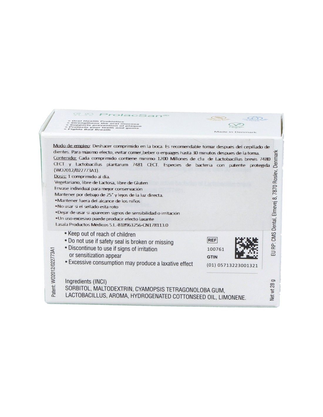 Agente texturizante (sorbitol), AB-Dentis® (Lactobacillus brevis y Lactobacillus plantarum), Estabilizador (Goma guar), Aroma de menta, Humectante(Aceite de semilla de algodón hidrogenado).