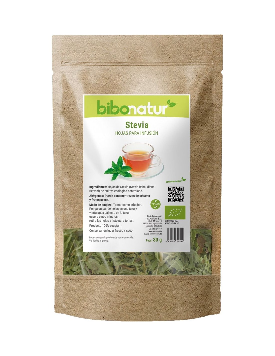 Ingredientes:Hojas de Stevia (Stevia Rebaudiana Bertoni) de cultivo ecológico controlado.Modo de empleo:Tomar como infusión.Ponga un par de hojas en una taza y vierta agua caliente en la taza, espere cinco minutos, retire las hojas y listo para tomar.Presentación:Envase de 30 gramos.Recomendaciones y advertencias:Producto ecológico y vegano. Libre de pesticidas. Puede contener trazas de sésamo y frutos secos.