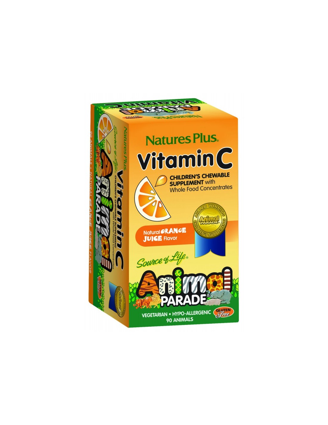 Animal Parade Vit.C. 90 Comp.Mast. de Natures Plus es un suplemento masticable para niños que aporta vitamina C, apoyando su sistema inmunológico mediante una fórmula natural y fácil de consumir.