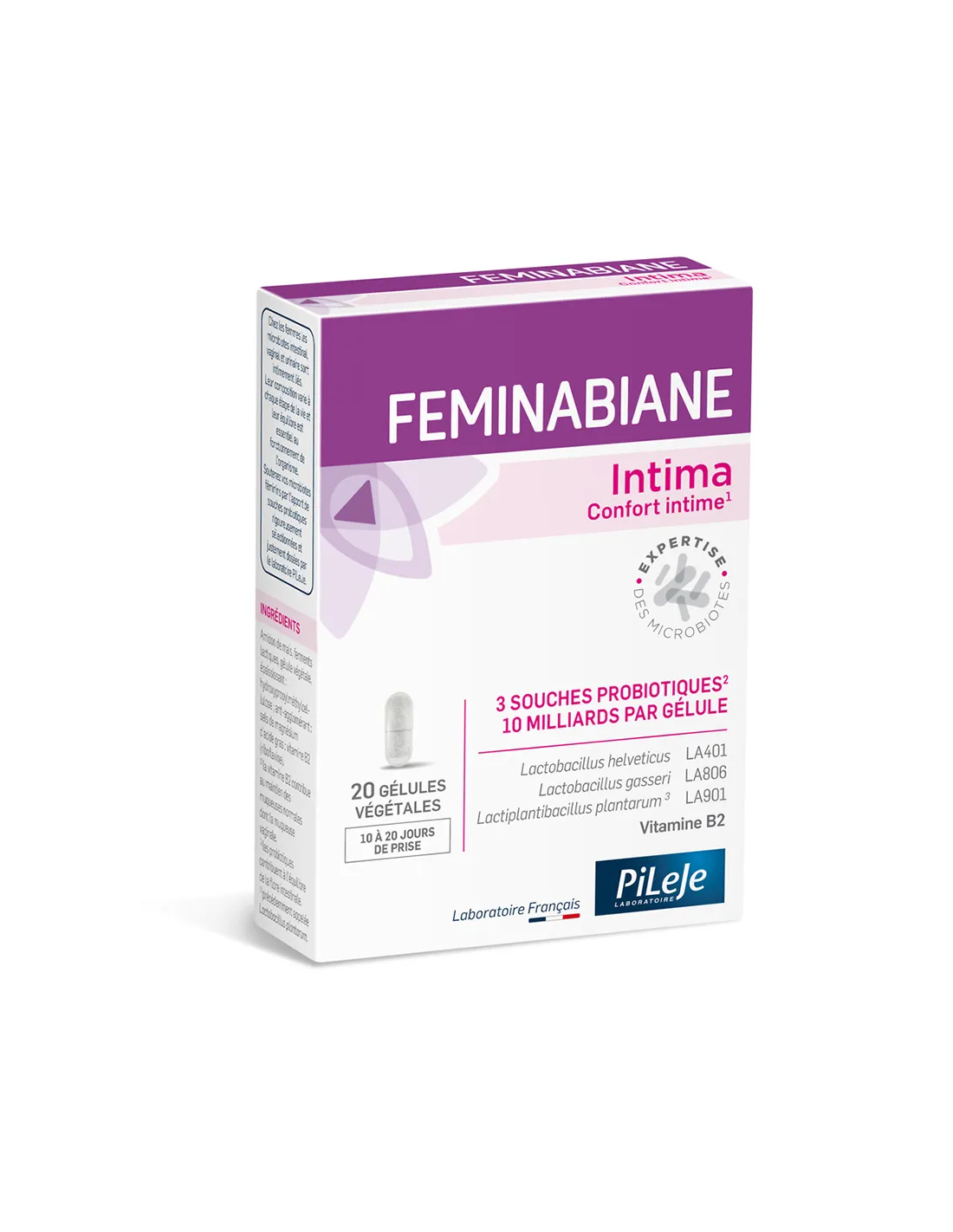 Feminabiane Intima 20 Cap de Pileje es un complemento alimenticio para mujeres que ayuda a mantener el equilibrio de la flora vaginal gracias a su fórmula con probióticos específicos.