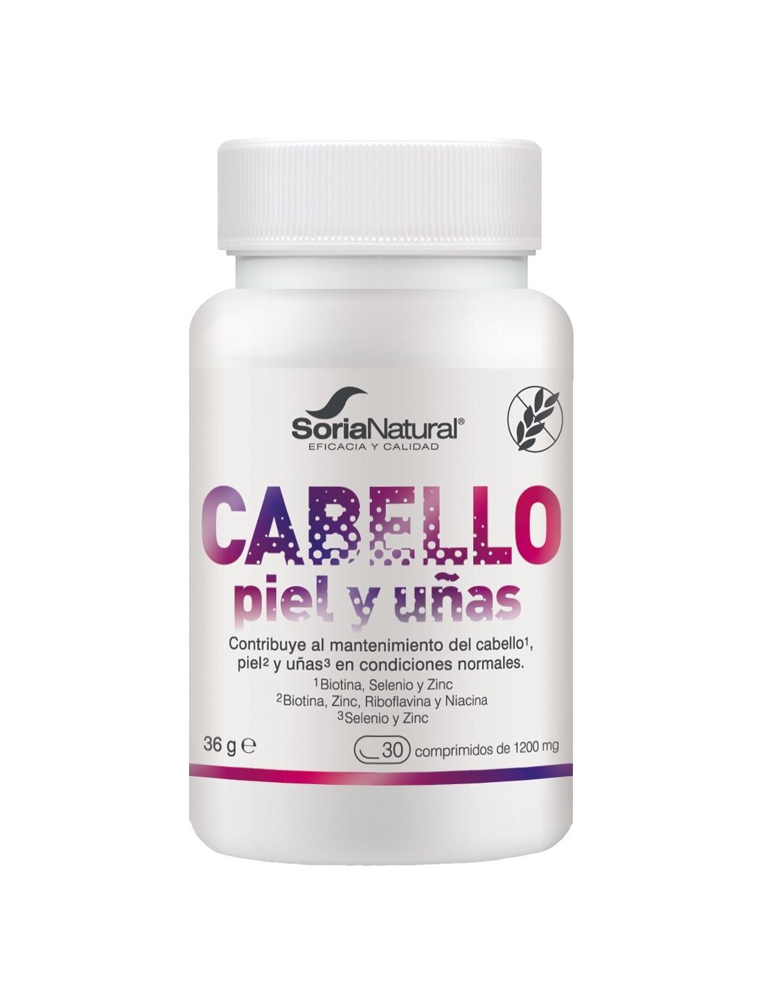 Cabello, Piel y Uñas de Soria Natural es una eficaz combinación de vitaminas, minerales y aminoácidos que aporta al organismo los componentes necesarios para mantener el buen estado de la piel y combatir la debilidad del cabello y la fragilidad de las uñas.Su presentación en forma de comprimidos de liberación sostenida, se favorece que los principios activos se liberen del cuerpo a una velocidad controlada y sostenida, para un mejor aprovechamiento de los mismos.Indicaciones: