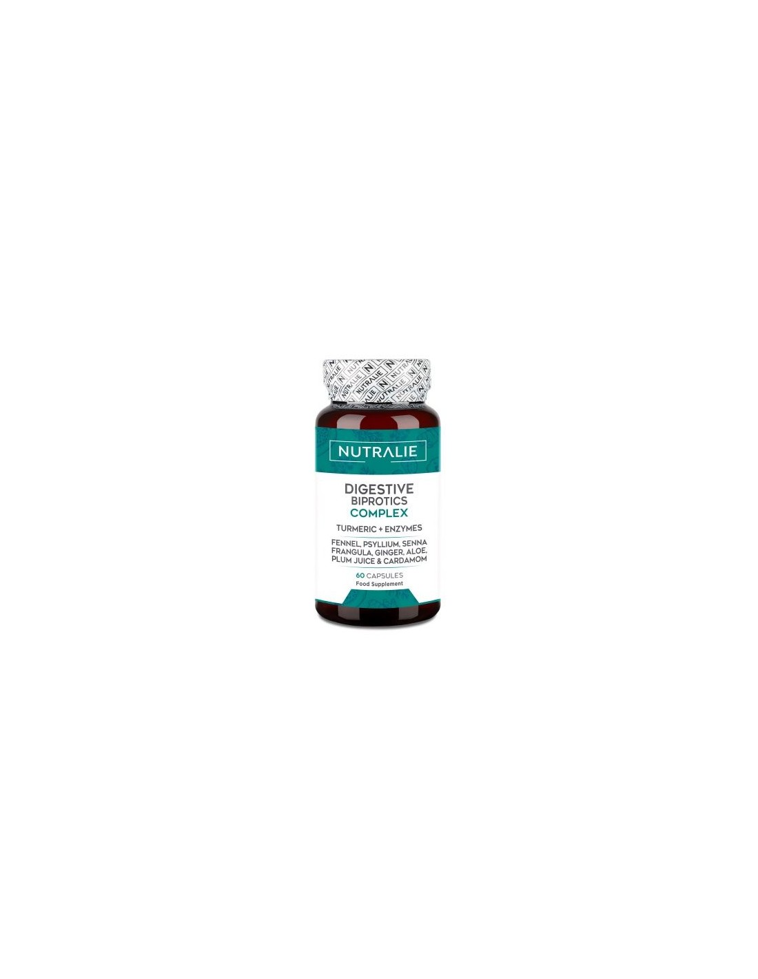 Digestive Biprotics Complex de Nutralie se ha desarrollado con el objetivo de contribuir en la mejora de la digestión, facilitando el proceso digestivo y el alivio de síntomas de digestiones pesadas, hinchazón e indigestión.Esta fórmula Complex Best In One de alta biodisponibilidad contiene además de probióticos y enzimas, otros ingredientes como cúrcuma, hinojo, psyllium, senna, frángula, jengibre, aloe vera, zumo de ciruela y cardamomo.Digestive Complex contribuye a aliviar los sintomas de dolor de aquellas personas que sufren de problemas de indigestión, malestar y pesadez tras las comidas.Composición activa por 2 cápsulas: