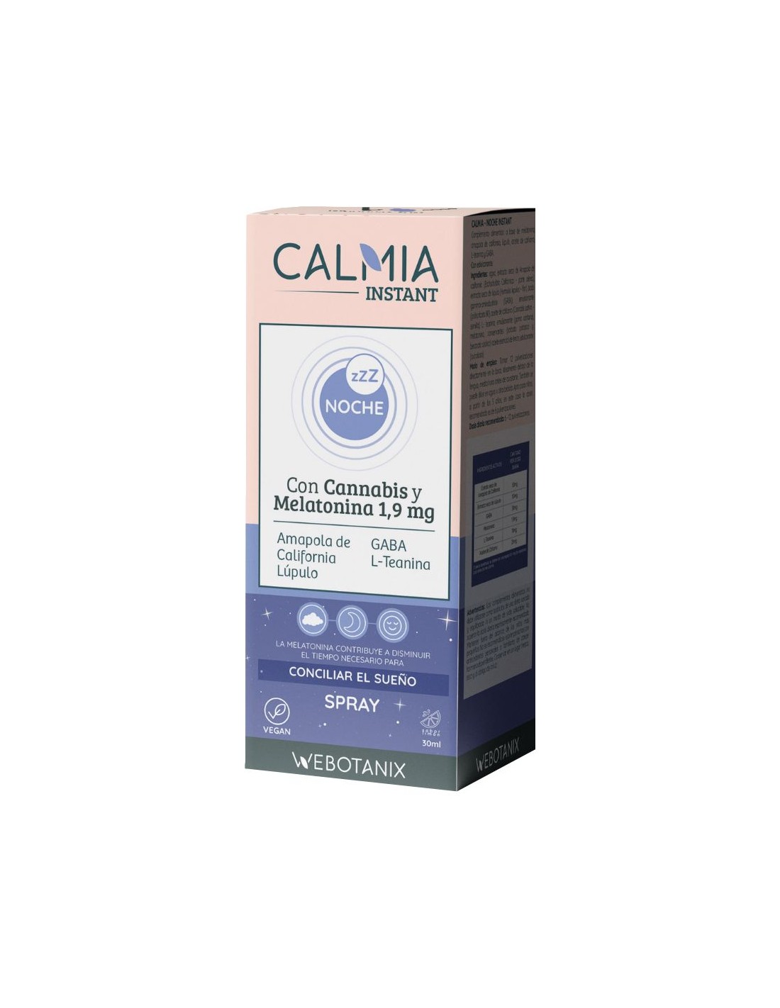 Calmia Noche Instant es un complemento alimenticio en formato spray sublingual que contiene una mezcla de Melatonina, Amapola de California, GABA, Lúpulo, L-teanina y Cáñamo. Esta fórmula única actúa sinérgicamente para promover la relajación y mejorar la calidad del sueño, despertándote con energía y sin somnolencia.Sabemos lo importante que es un buen descanso para conseguir un bienestar general. Por eso, hemos desarrollado Calmia Noche Instant: Innovador, eficaz y.... ¡de efecto inmediato!Este innovador spray sublingual está diseñado para ayudarte a conciliar el sueño de manera rápida y efectiva, utilizando una combinación de ingredientes naturales cuidadosamente seleccionados por sus propiedades relajantes.Principios activos: