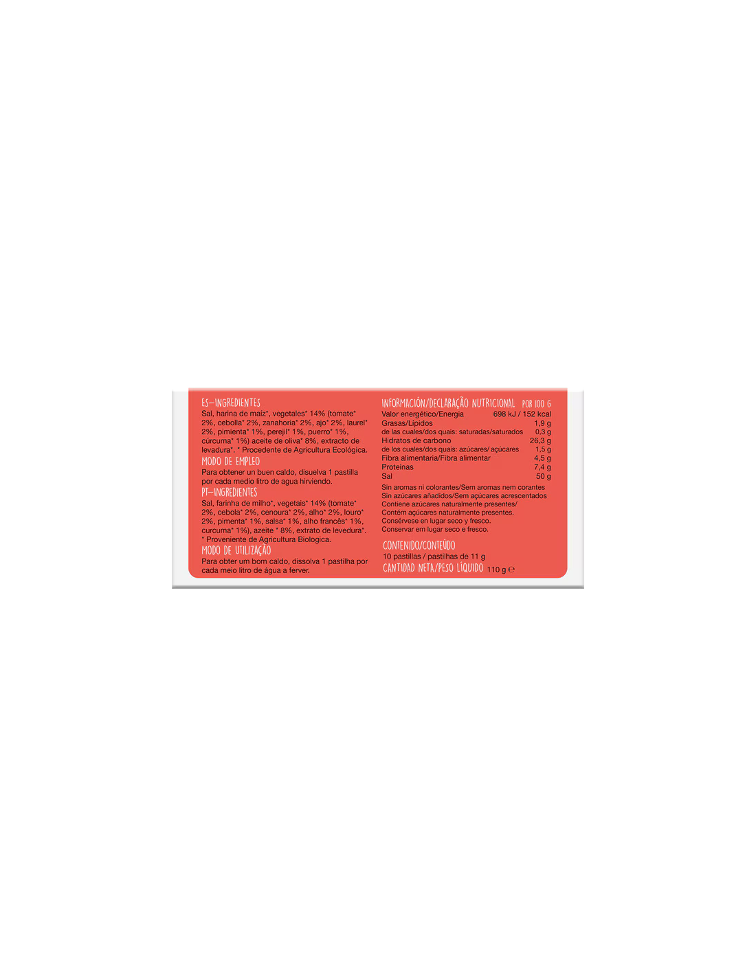 Modo de empleo:Para obtener un buen caldo, disuelva una pastilla por cada medio litro de agua hirviendo.Presentación:Envase con 10 pastillas.Recomendaciones y advertencias:Producto vegano. No contiene gluten, glutamato ni aceite de palma.