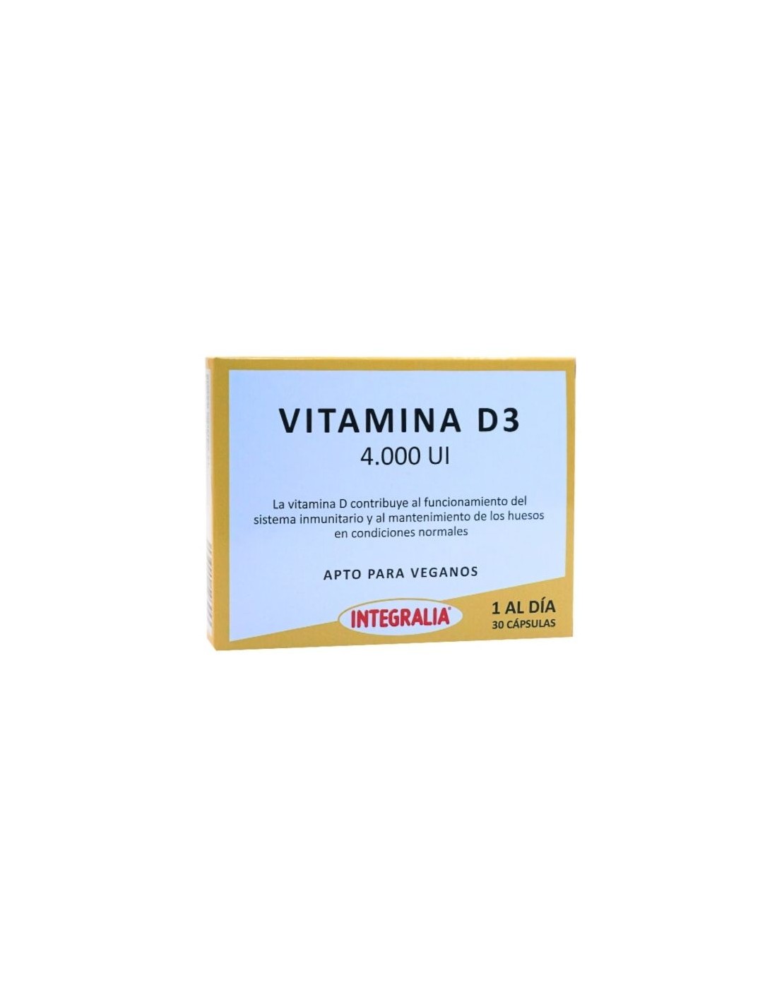 La Vitamina D3 ayuda a mantener niveles normales de calcio en sangre y contribuye al mantenimiento de los huesos y dientes en condiciones normales.Composición activa por cápsula:125 mcg de vitamina D3 (colecalciferol)(4.000 UI).Modo de empleo:Tomar 1 cápsula al día.Presentación:Envase de 30 cápsulas.Recomendaciones y advertencias:Apto para veganos.