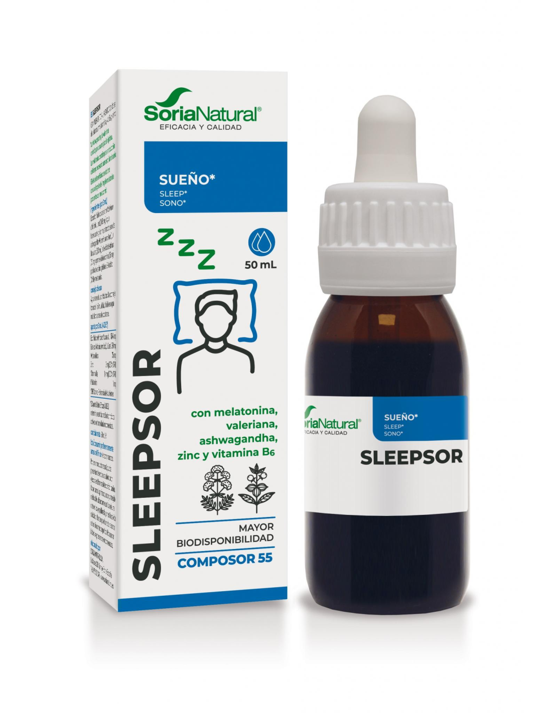 Composor 55 - Sleepsor de Soria Natural es un complemento alimenticio a base de vitamina B6, zinc, melatonina y plantas (Valeriana y Ashwagandha) que ayuda a iniciar y mantener el sueño y a combatir el estrés, la causa más frecuente del insomnio agudo.Se presenta en un formato galénico que permite la liberación sostenida de sus componentes activos, garantizando un efecto mantenido y en presentación líquida, en gotas, que facilita una prescripción individualizada en función de las necesidades de cada individuo.Recomendado para:
