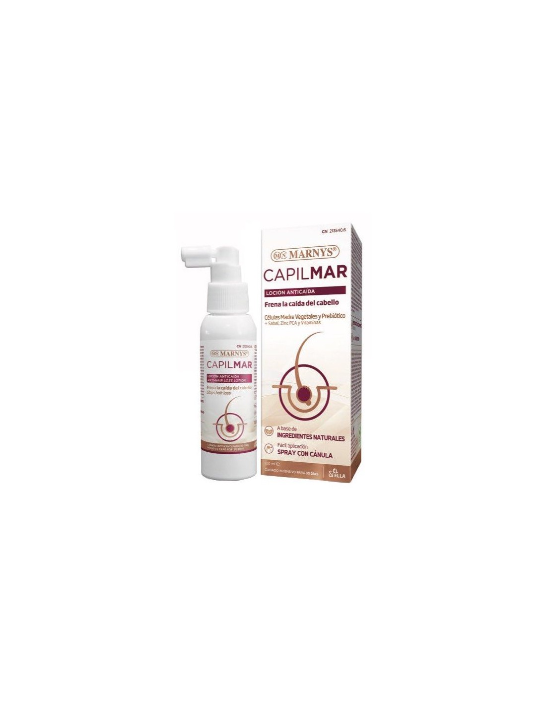 Capilmar Loción Anticaída de Marnys es un spray para el cuero cabelludo de fácil aplicación con cánula, que frena la caída intensa y/o acelerada del cabello. Sus ingredientes activos actúan prolongando la fase de crecimiento del cabello.La asociación de sus ingredientes activos frena la caída del cabello, favorece la fase de crecimiento del cabello y estimula la producción de queratina endógena (propia).Está recomendado tanto para hombres como para mujeres mayores de 18 años, que presenten una caída del cabello acelerada ya sea intensa o estacional, revitalizando el cuero cabelludo, manteniendo la funcionalidad del folículo piloso y devolviendo firmeza al cabello.Beneficios: