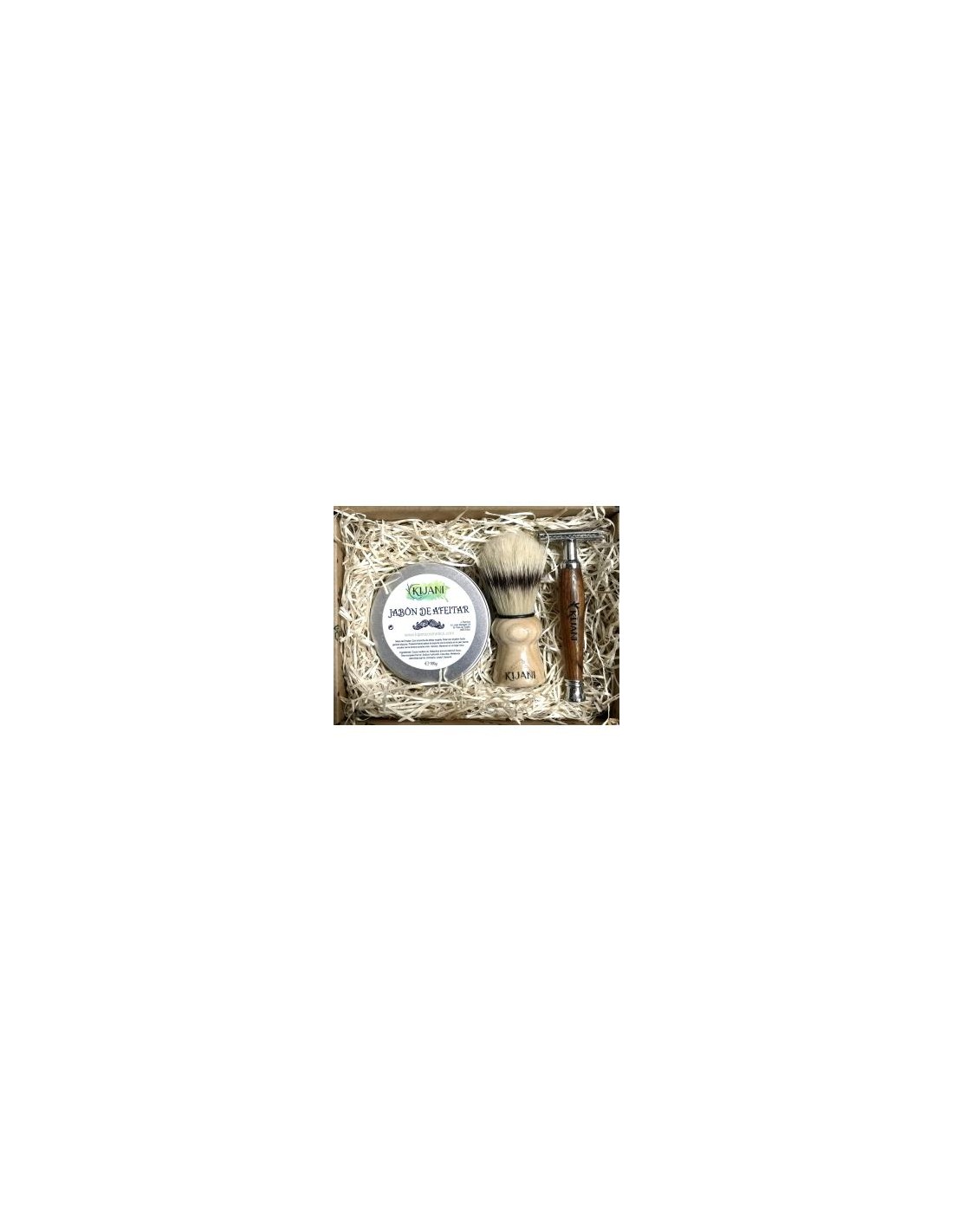 Pack de afeitar con un jabón de afeitado de lavanda, una maquinilla y una brocha de afeitar. Productos de artesanía para la barba.