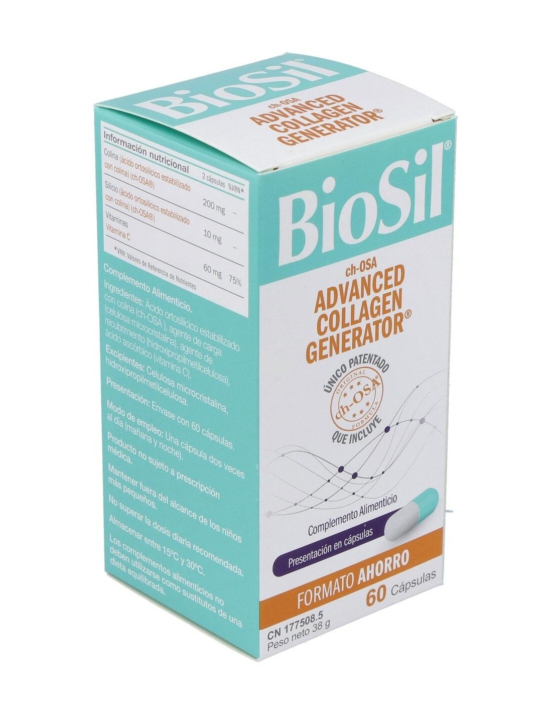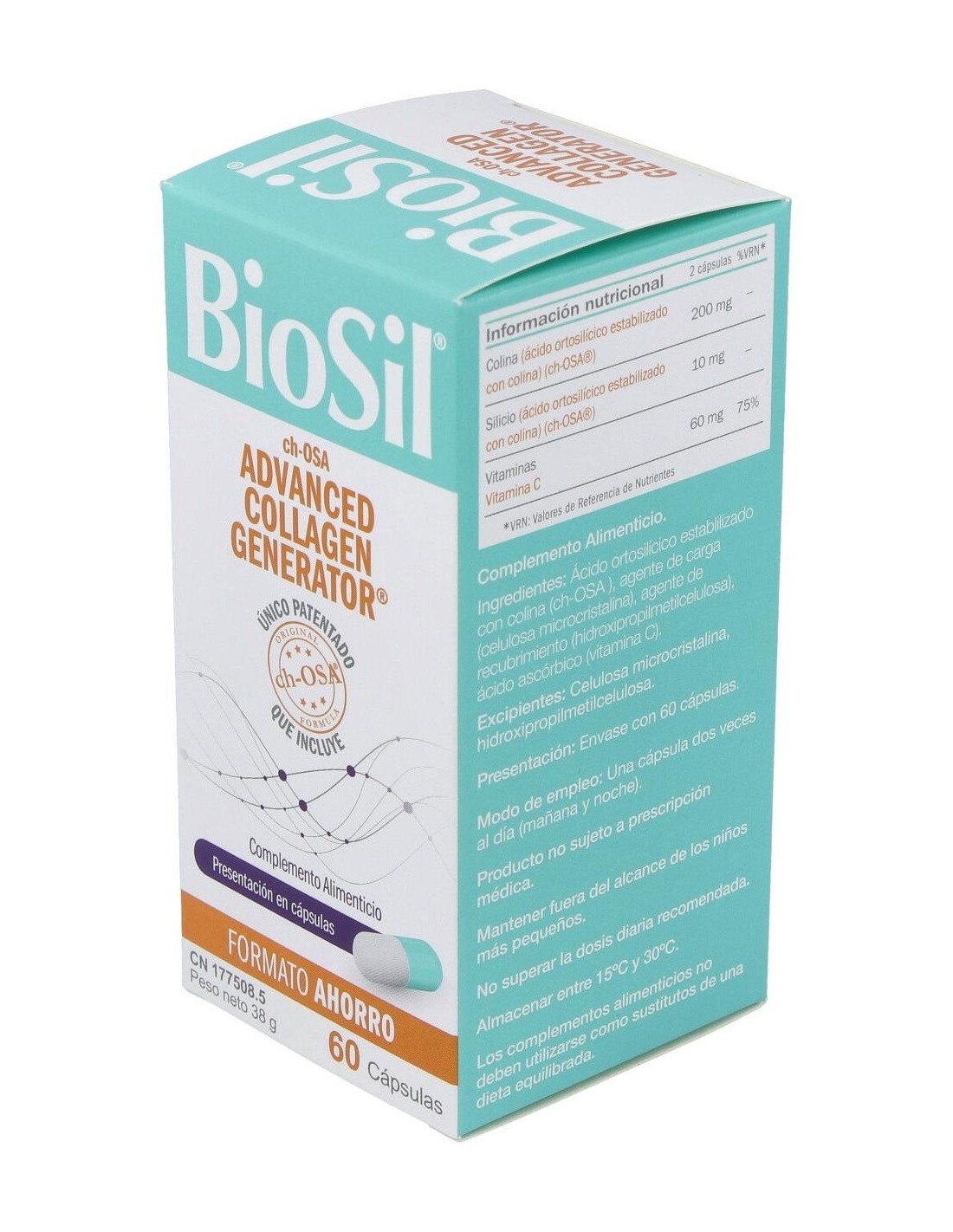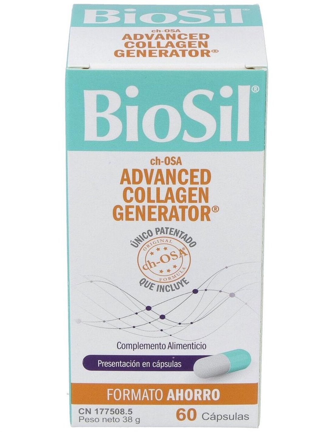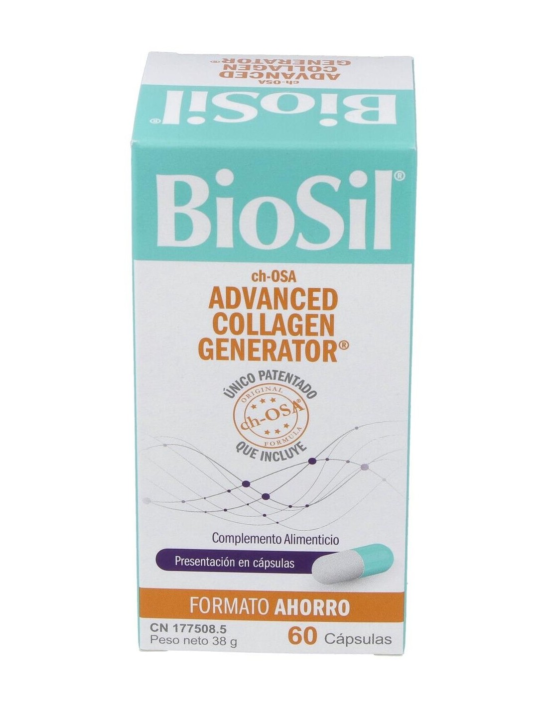 BIOSIL | BioSil 60cápsEl colágeno es una proteína que genera fibras muy resistentes y flexibles, las cuales forman parte de muchos tejidos de nuestro cuerpo: articulaciones, huesos, piel, músculos y tendones.Nuestro organismo produce colágeno, pero a partir de los 30 años pierde capacidad para generar esta proteína, por lo que las zonas que contienen colágeno empezarán a envejecer y se puede perder movilidad en las articulaciones o tersura en la piel.