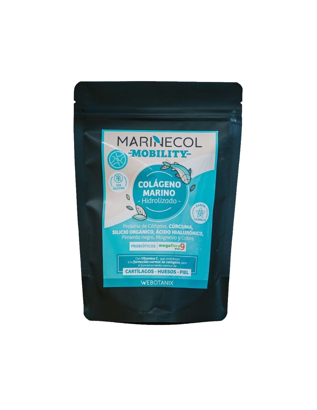 Marinecol Mobility de WeBotanix es un complemento alimenticio a base de proteína de colágeno marino, extractos de plantas, ácido hialurónico, vitamina C, magnesio, cobre y probióticos.Marinecol Mobility de WeBotanix aprovecha los beneficios del colágeno en articulaciones, huesos y músculos. Indicado para personas que quieran aprovechar los beneficios del colágeno para fortalecer la salud articular, ósea y muscular.Ingredientes:Colágeno marino hidrolizado*(muy bajo peso molecular), citrato de magnesio, extracto seco de acerola (Malpighia Punicifolia fruta), extracto seco de cúrcuma (Curcuma longa raíz), extracto seco de bambú (Bambusa vulgaris tallo), proteína de cáñamo (Cannabis sativa semilla), megaflora Evo**, ácido hialurónico, aroma, gluconato de cobre, extracto seco de pimienta negra (Piper nigrum fruto). (*) Origen pescado y crustáceos.(**) Almidón y maltodextrina de maíz, fructooligosacáridos (FOS), inulina, dextrina de maíz, cloruro de potasio (estabilizador), proteína hidrolizada vegetal, sulfato de magnesio, probióticos (Lactobacillus acidophilus W22, Lactobacillus plantarum W21, Lactobacillus plantarum W1, Lactobacillus paracasei W20, Lactobacillus salivarius W24, Lactococcus lactis W19, Bifidobacterium lactis W51, Bifidobacterium lactis W52 y Enterococcus faecium W54), enzima (amilasa) y sulfato de manganeso.Modo de empleo:Mezclar 2 cacitos dosificadores (aprox. 11 g) en agua, zumo o cualquier otra bebida y remover bien. Tomar una vez al día, preferiblemente con el desayuno.Presentación:Envase de 275 gramos sabor vainilla.Recomendaciones y advertencias:No contiene gluten, lactosa, azúcares añadidos ni edulcorantes artificiales. No GMO. No ionizado. Contiene pescado y crustáceos.
