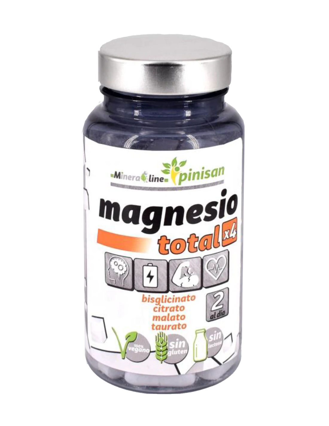 Magnesio Total x4 de Pinisan es un complemento alimenticio con cuatro tipos de magnesio (citrato, bisglicinato, malato y taurato) para mejorar su absorción y beneficios. Combina citrato, bisglicinato, malato y taurato de magnesio para una óptima absorción, ayudando a la función muscular y nerviosa, reduciendo el cansancio y apoyando la salud ósea y el metabolismo energético.