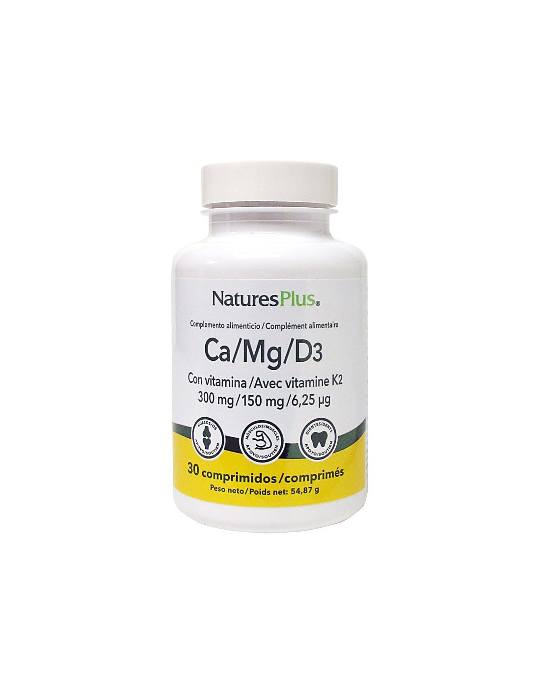 El Ca/Mg/D3 + K2 30 Comprimidos de Natures Plus es un suplemento para adultos que contribuye al mantenimiento de huesos y dientes saludables, combinando calcio, magnesio, vitamina D3 y vitamina K2 en una fórmula equilibrada.