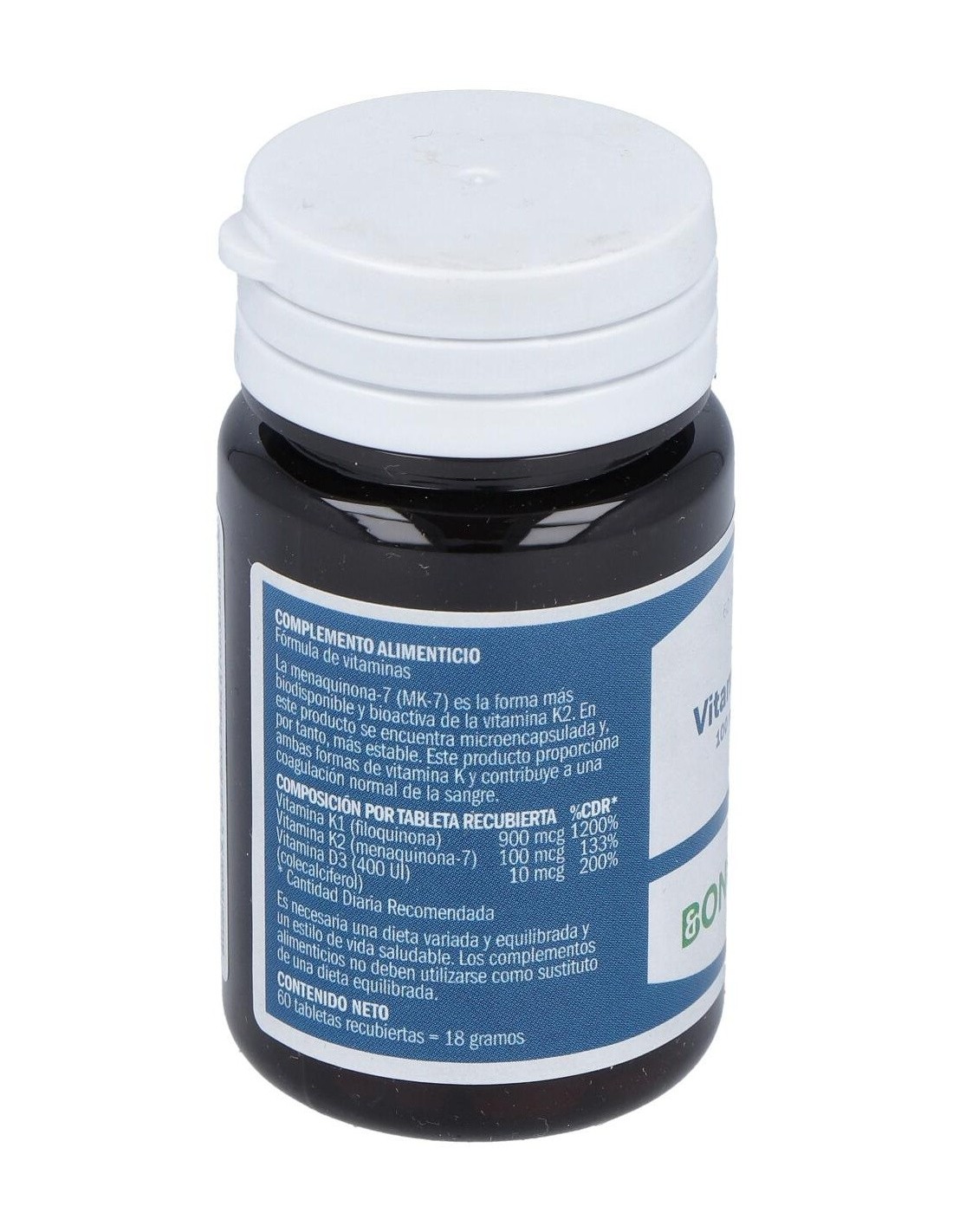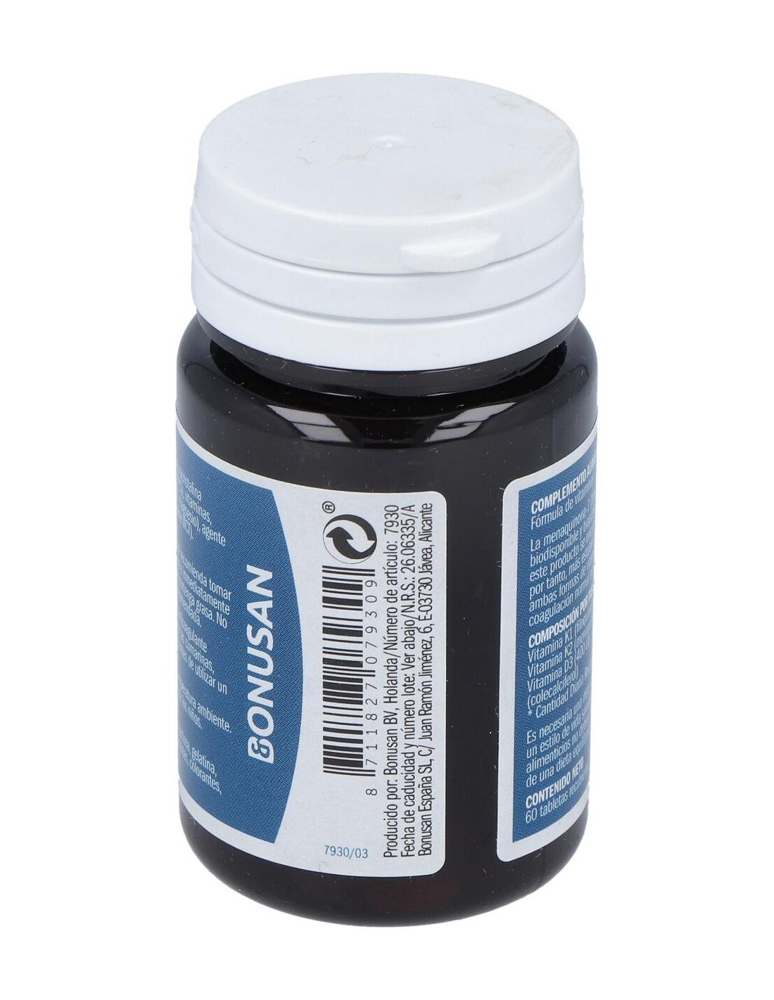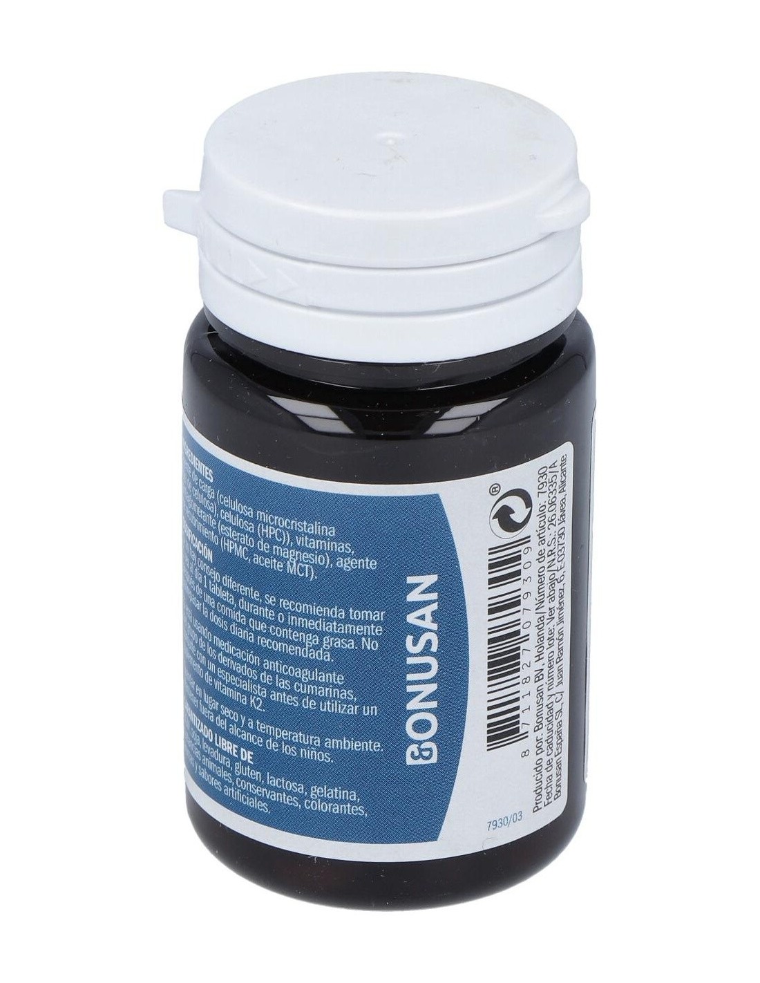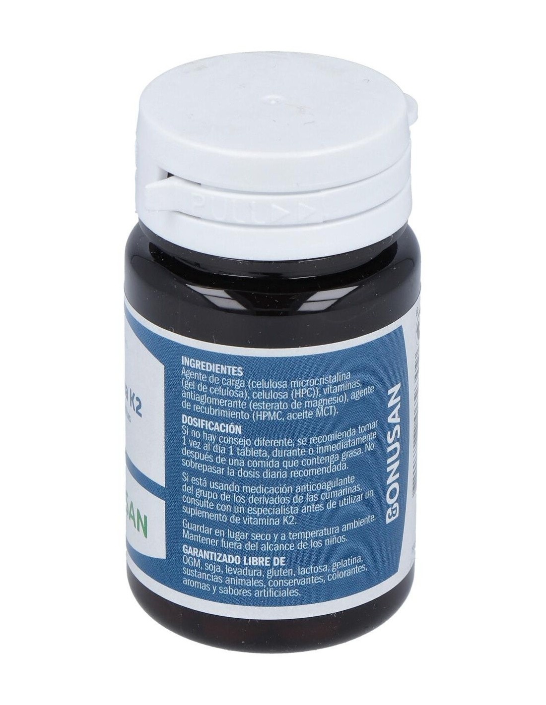 La vitamina K2 es una vitamina beneficiosa para los huesos y el sistema circulatorio. Ayuda a la coagulación de la sangre y a mantener los huesos fuertes y sanos. La vitamina K2 es única para los beneficios de los efectos energéticos. A fin de optimizar los efectos de la vitamina K2, Bonusan ha añadido vitamina D3, la forma más activa de la vitamina D. La adición de vitamina D3 asegura una absorción de seis a ocho veces mayor de la vitamina K2 y garantizando la máxima eficacia de sus principios activos en el cuerpo. Debido a sus efectos beneficiosos sobre los huesos y sistema circulatorio, la vitamina K2 es aconsejada también para personas de edad avanzada.