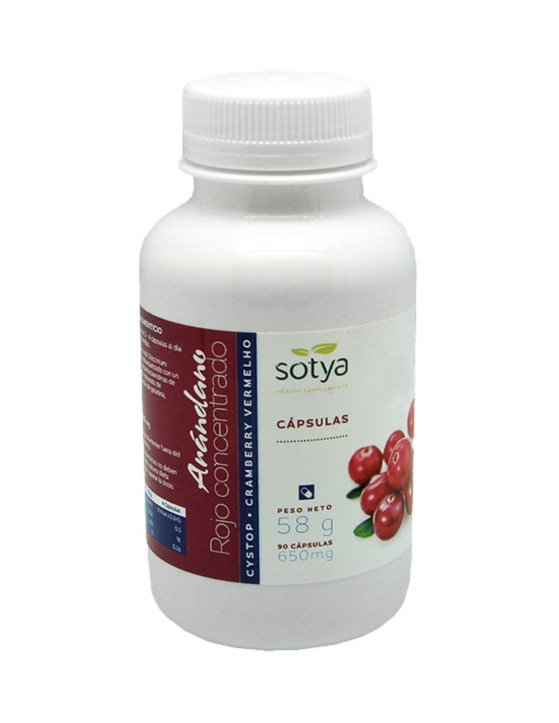 El Arándano Rojo Concentrado 650Mg Cáps. 90U de Sotya es un suplemento para adultos que apoya la salud urinaria mediante una fórmula concentrada de arándano rojo.