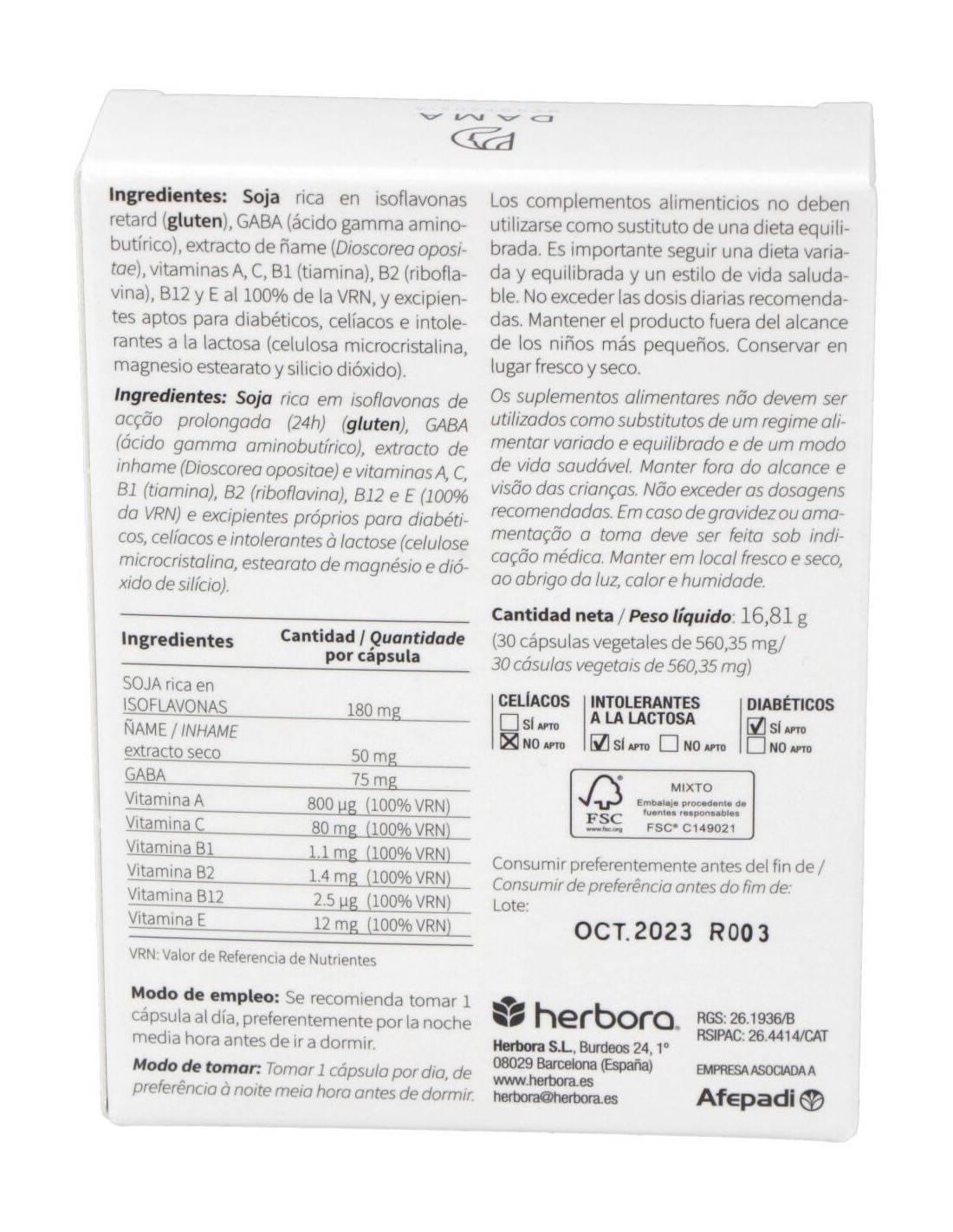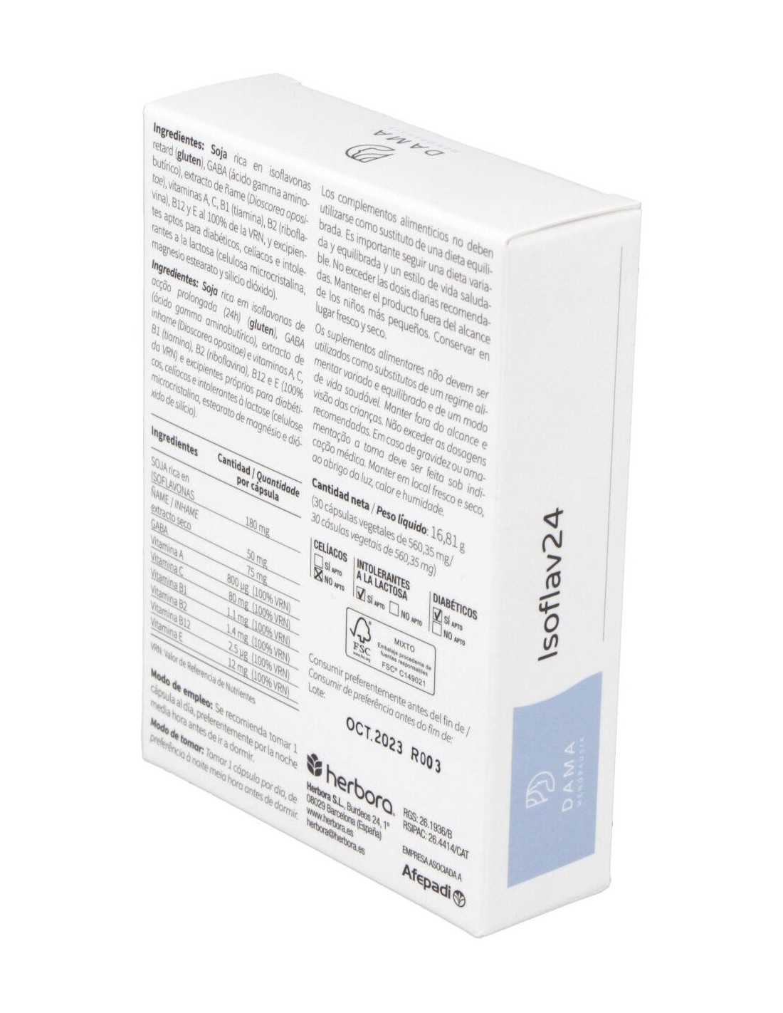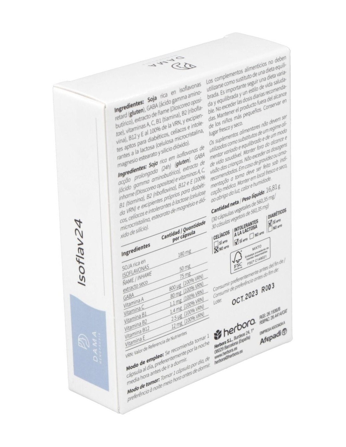 Isoflav24 de Herbora está compuesto principalmente por extracto de soja estandarizado en isoflavonas, presentado en cápsulas de fácil consumo. Su diseño permite una absorción adecuada para quienes buscan complementar su alimentación con fitoquímicos derivados de fuentes vegetales.