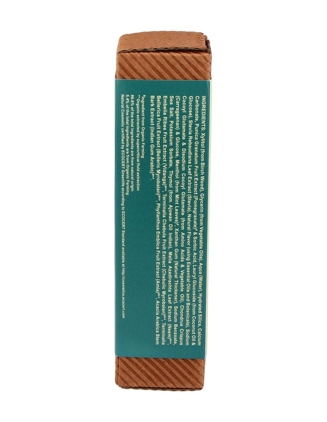 XYLITOL (ABEDUL DEL HIMALAYA), GLICERINA (DE ACEITES VEGETALES), AGUA, CARBONATO CÁLCICO, SÍLICA HIDRATADA (MINERAL NATURAL), EXTRACTO DE PUNICA GRANATUM (GRANADA)XXX, LAURYL GLUCOSIDE (DE ACEITE DE COCO Y AZÚCAR), SODIO COCOYL GLUTAMATO Y DISODIO COCOYL GLUTAMATO (DE AMINOÁCIDOS Y ACEITE VEGETAL), EXTRACTO DE STEVIA REBAUDIANA (STEVIA), AROMA NATURAL (ACEITES ESENCIALES Y BOTÁNICOS), CHONDRUS CRISPUS (CARRAGENATO) Y GLUCOSA, MENTOL (DE HOJAS DE MENTA PIPERITA)XXX, GOMA XANTANA (ESPESANTE NATURAL), BENZOATO SÓDICO, SAL MARINA, SORBATO POTÁSICO, TIMOL (DE ACEITE DE TOMILLO), EXTRACTO DE FRUTA DE EMBLICA RIBES (VIDANGA)*, EXTRACTO DEL FRUTO DE TERMINALIA CHEBULA (MYROBALAN QUEBULÍTICO)*, EXTRACTO DEL FRUTO DE TERMINALIA BELLERICA (MYROBALAN BELLERICA)*, EXTRACTO DEL FRUTO DE PHYLLANTUS EMBLICA (GROSELLERO ÍNDICO)*, EXTRACTO DE CORTEZA DE ACACIA NILOTICA (GOMA ARÁBIGA ÍNDIA)*, EXTRACTO DE HOJA DE MELIA AZADIRACHTA (NEEM, LILA INDIA)*.