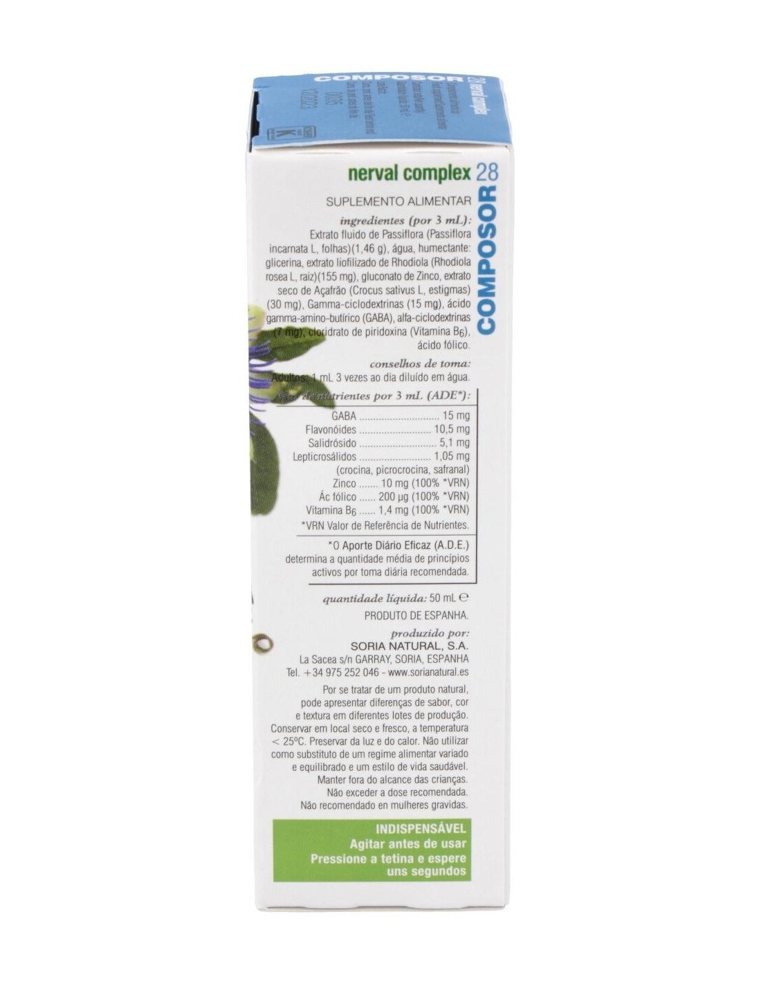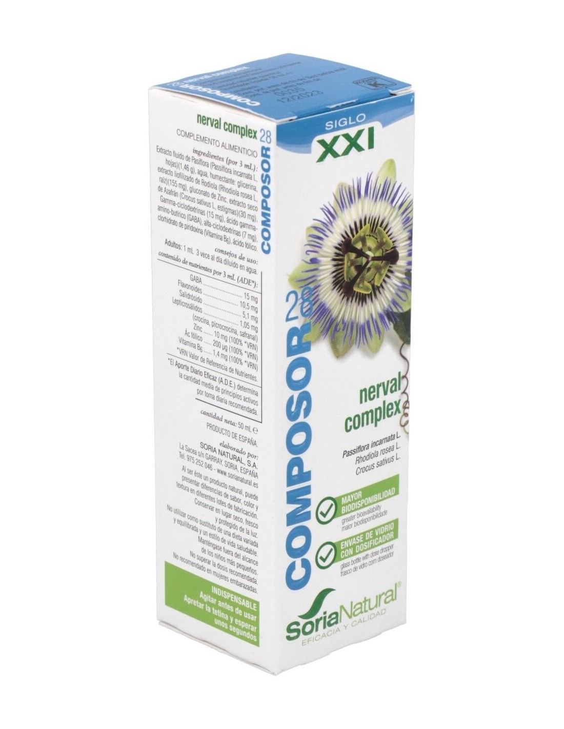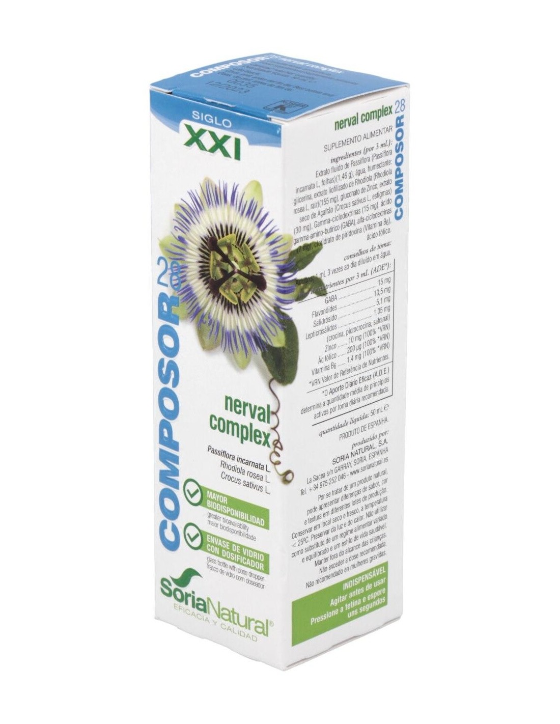 Composor 28 Nerval Complex Xxi 50Ml. de Soria Natural es un complemento formulado para personas que buscan apoyar su bienestar emocional y equilibrio diario mediante ingredientes naturales. Está diseñado para quienes prefieren opciones basadas en extractos vegetales dentro de su rutina de cuidado personal.