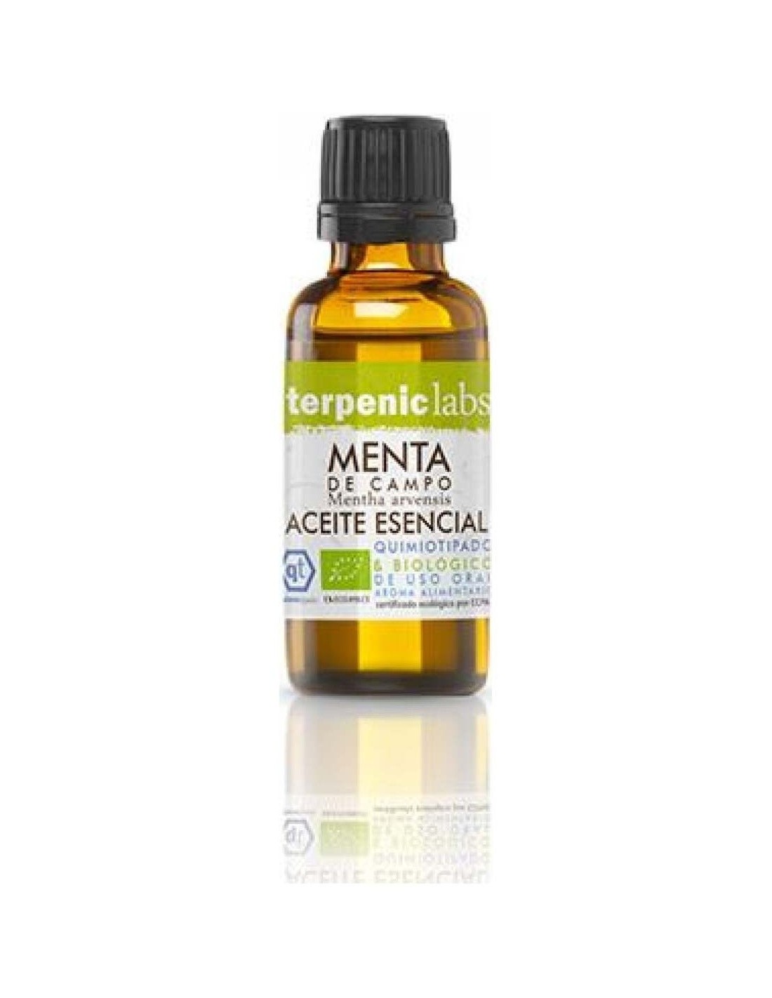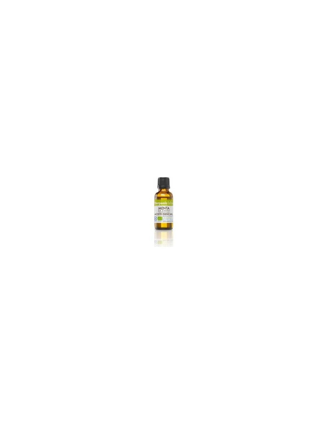 Aceite esencial de Menta de campo. El producto es 100% extracto de planta natural, el cual contiene ecoetiqueta que certifica el origen ecológico dentro de la unión europea.