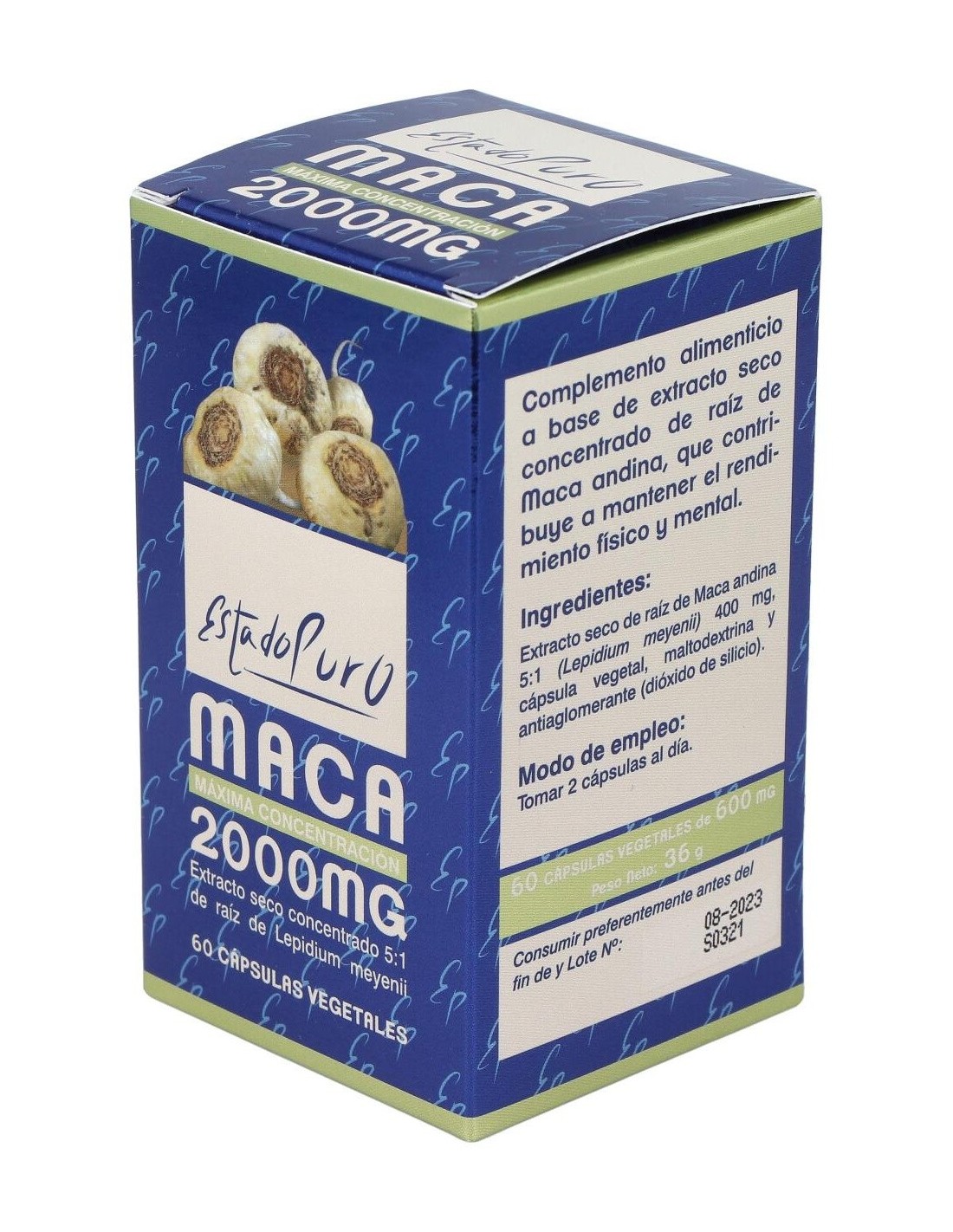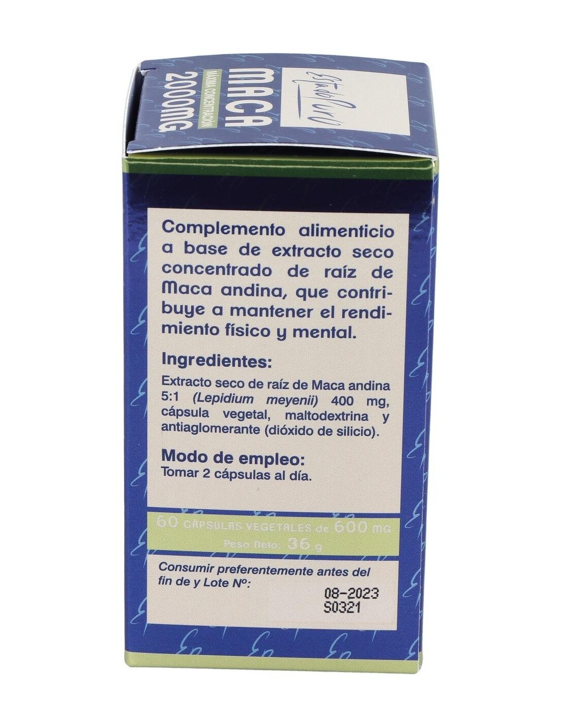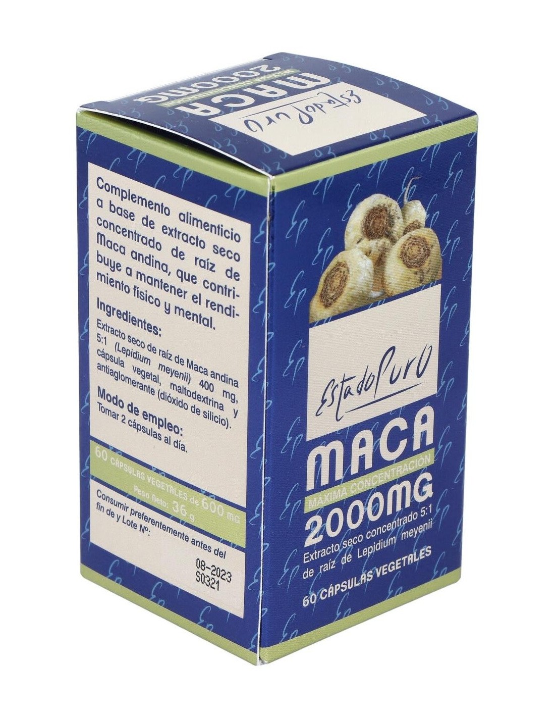 - Cada cápsula contiene 2000 mg de maca en estado puro, facilitando una dosificación práctica y constante.