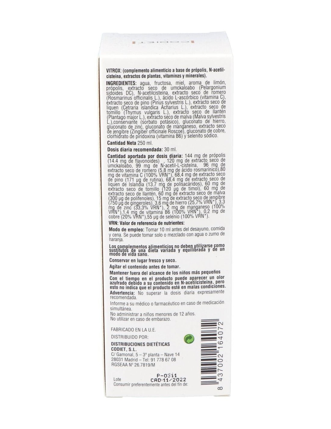 Agua: Miel: N- acetil cisteína: Extracto seco de Própolis: Extracto seco de Pelargonium Sidoides: Extracto seco de Drosera (Drosera rotundifolia): Extracto seco de Romero (Rosmarinus officinalis): Extracto seco de Pino (Pinus spp): Extracto seco de Liquen (Cetraria islándica Ach): Gluconato de Hierro: Vitamina C (ác. L ascórbico): Gluconato de Zinc: Extracto seco de Tomillo (Thymus vulgaris): Extracto seco de Llantén (Plantago spp): Extracto seco de Jengibre (Zingiber officinale Roscoe): Extracto seco de Malva (Malva sylvestris L): Gluconato de Manganeso: Gluconato de Cobre: Vitamina B6 (Piridoxina clorhidrato) y Selenio.