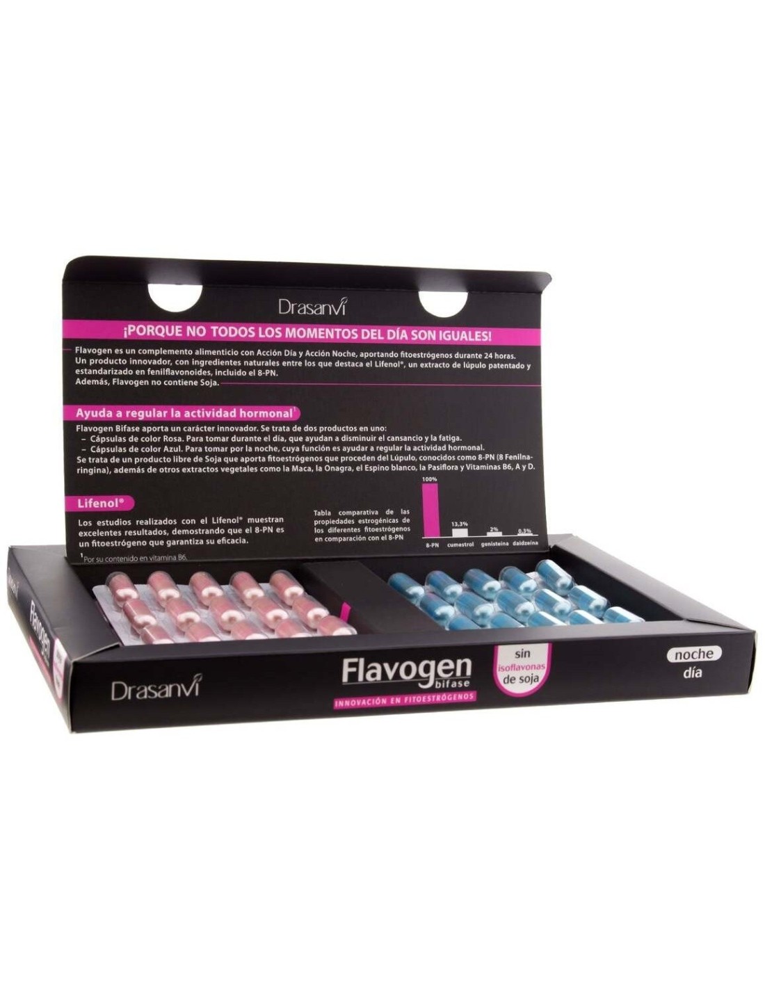 ¿Qué es Flavogen Bifase?Flavogen bifase es un innovador complemento creado para ayudar a calmar los síntomas de la menopausia. Gracias al extracto patentado del lúpulo (Lifenol®) aporta una fuente de fitoestrógenos vegetales, similares a los estrógenos femeninos, que contribuyen a la disminución de los síntomas asociados a la menopausia.Estudios clínicos realizados con una ingesta de 85 mg de Lifenol® diarios durante 6 semanas han desvelado una reducción de un 31% en los sofocos y en más de un 75% de los casos, las mujeres menopausicas han mejorado significativamente los síntomas derivados de la menopausia. ¿Como tomar Flavogen Bifase?Flavogen Bifase es un complemento de doble acción. Por la mañana se toma la pastilla color rosa, que aporta Lifenol® junto con otros componentes que permiten obtener un aporte extra de vitalidad. Además aporta calcio y minerales que previenen de la descalcificación propia de esta etapa. Por la noche se toma la pastilla azul, que aporta Lifenol® junto con espino blanco y pasiflora para garantizar un adecuado descanso nocturno. Pincha aquí para obtener más información acerca del funcionamiento del Lifenol®. Ingredientes activos cápsula día: