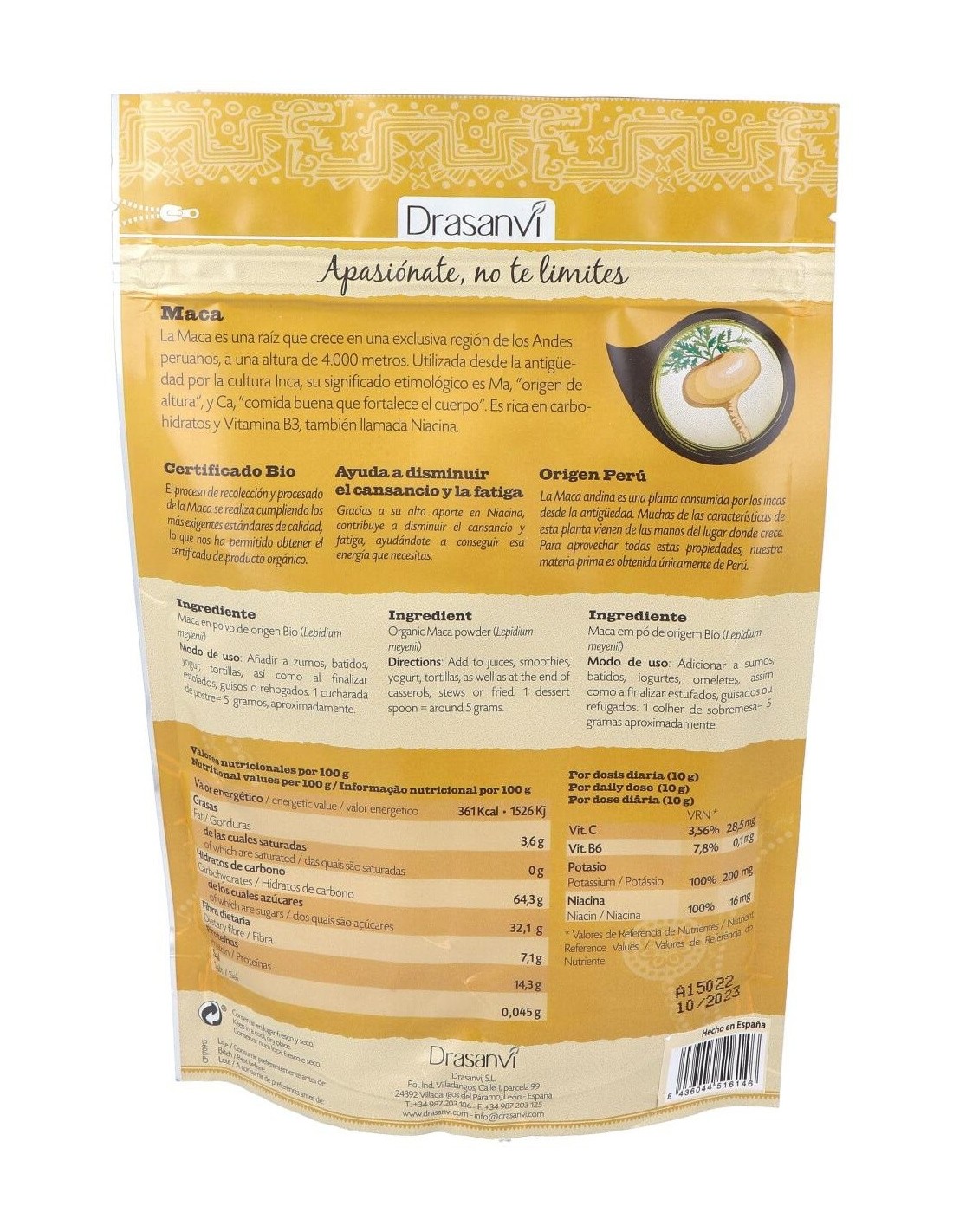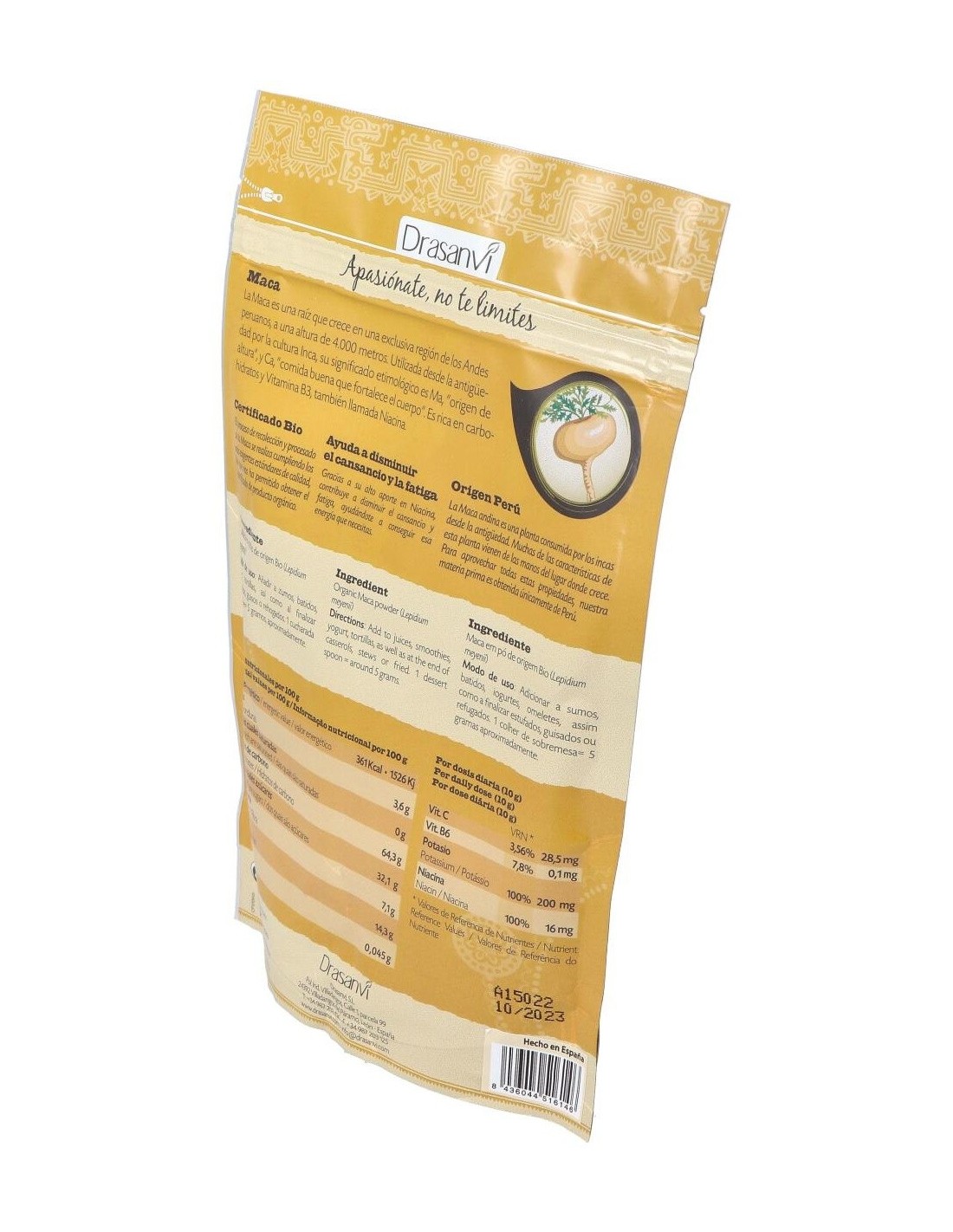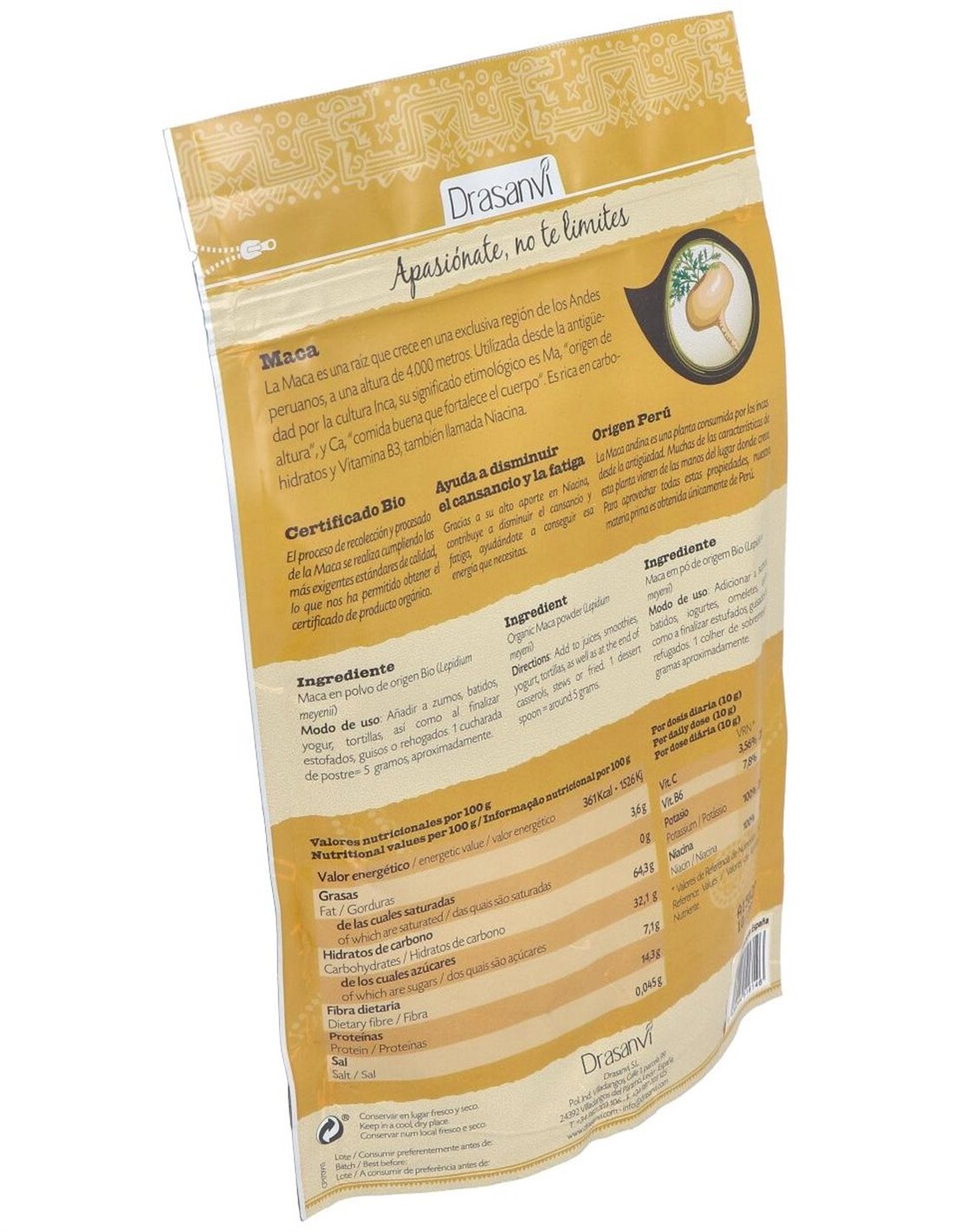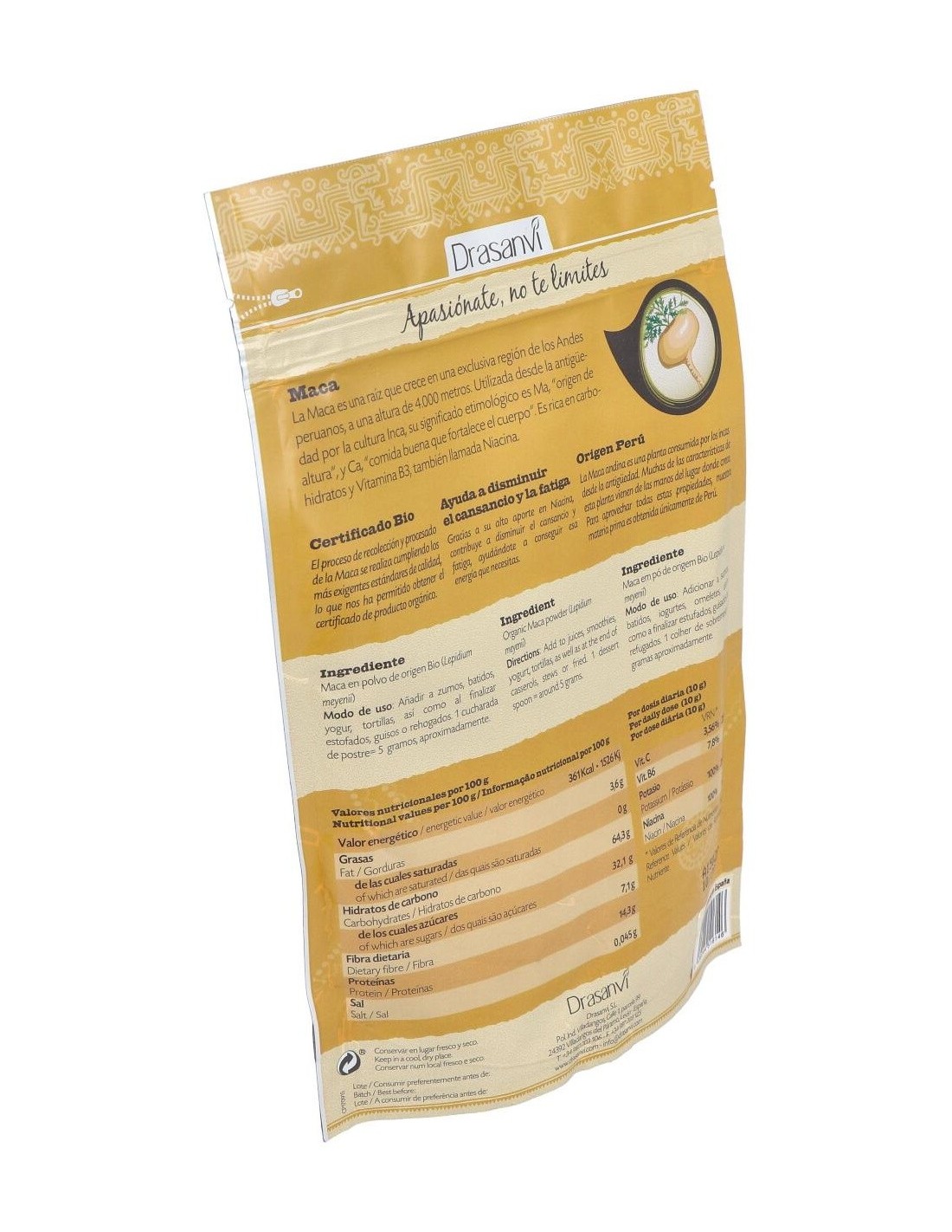 La maca, es una raíz que crece en una exclusiva región de los Ándes peruanos, a una altura de 4000 metros. Es rica en carbohidratos y vitamina B3 (Niacina) que ayudan a disminuir el cansancio y la fatiga. Utilizada por la cultura Inca, y cuyo significado etimológico dice mucho de ella: Ma origen de altura y Ca comida buena que fortalece el cuerpo. La maca, ese tubérculo peruano del que todo el mundo habla, ¿y por qué es tan famoso? La maca es una excelente fuente de energía. Su sabor dulce, la convierten en una excelente harina a utilizar en panes y repostería y otros alimentos con los que comenzar el día con buen pie. Composición por dosis diaria:10 grs de maca en polvo de origen BIO. Modo de empleo:Se recomienda tomar 10 g diarios. Los usos sugeridos son los siguientes: Desayuno: Galletas de maca.