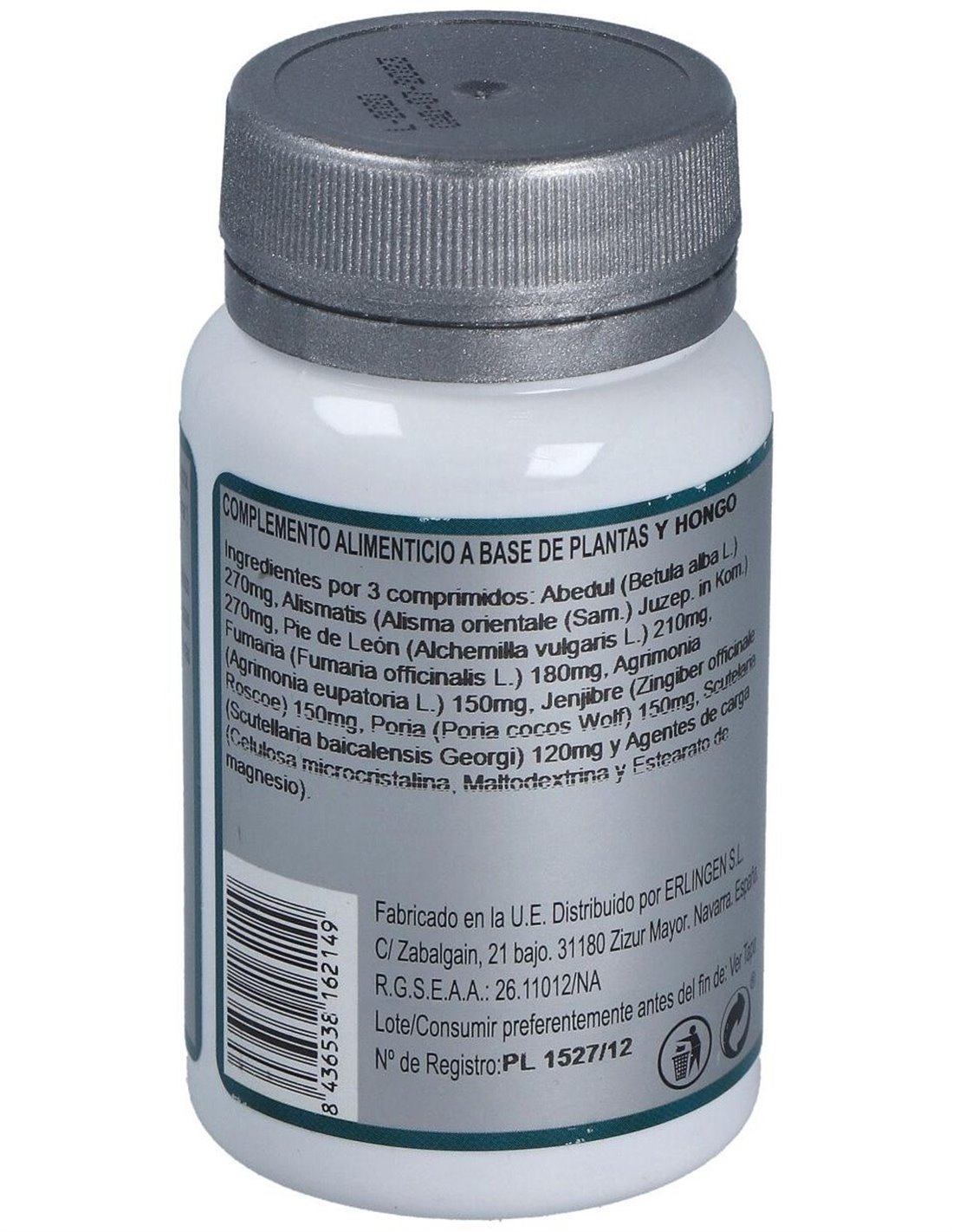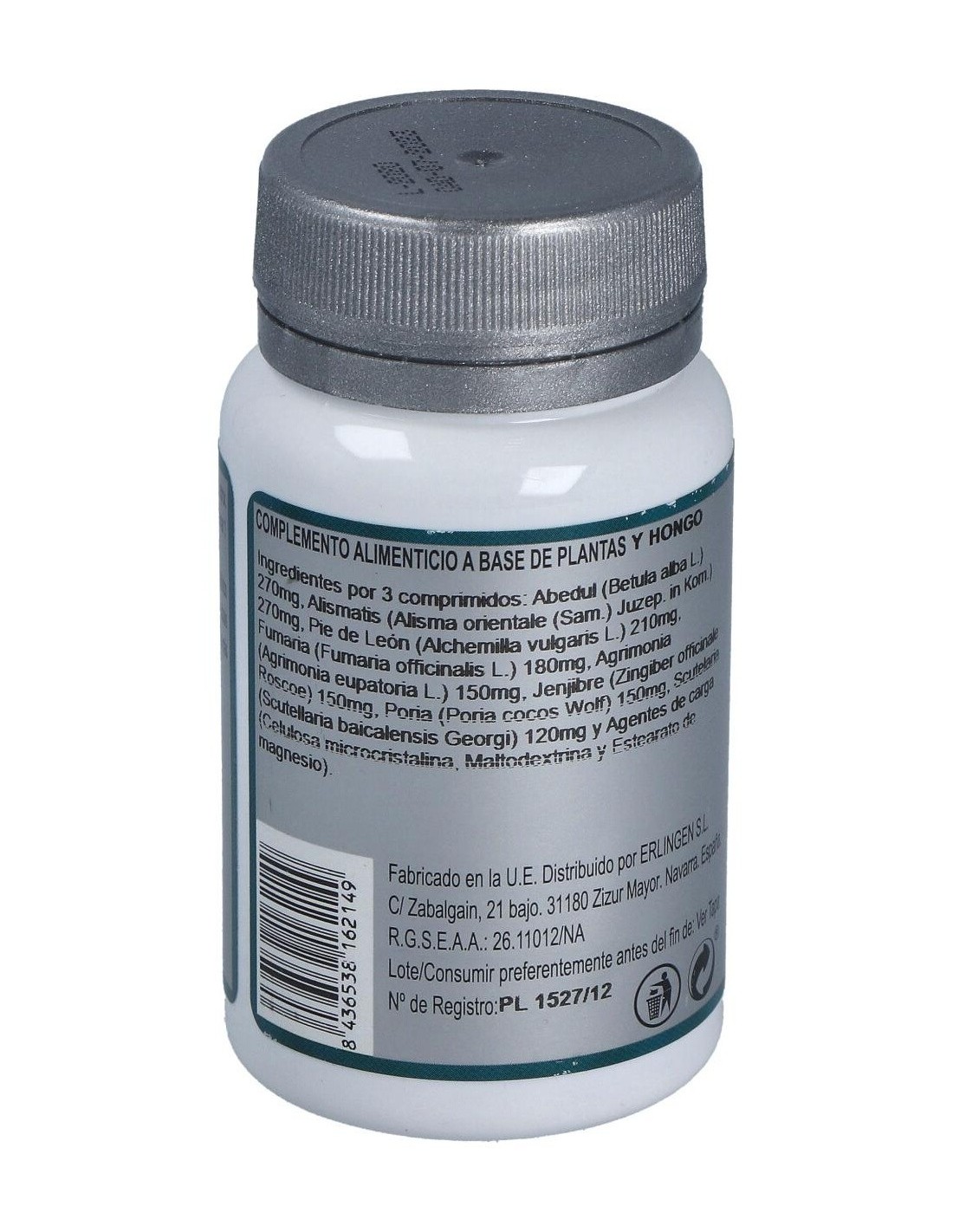 Abedul (Betula alba L.) 270 mg, Alismatis (Alisma orientale (Sam.) Juzep. in Kom.) 270 mg, Pie de León (Alchemilla vulgaris L.) 210mg, Fumaria (Fumaria officinalis L.) 18 0mg, Agrimonia (Agrimonia eupatoria L.) 150 mg, Jengibre (Zingiber officinale Roscoe) 150 mg, Poria (Poria cocos Wolf) 150 mg, Scutelaria (Scutellaria baicalensis Georgi) 120 mg y Agentes de carga (Celulosa microcristalina, Maltodextrina y Estearato de magnesio).