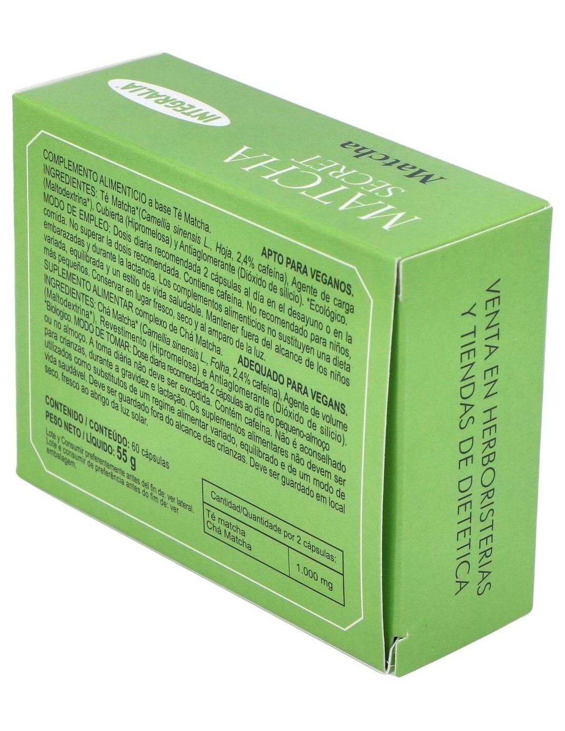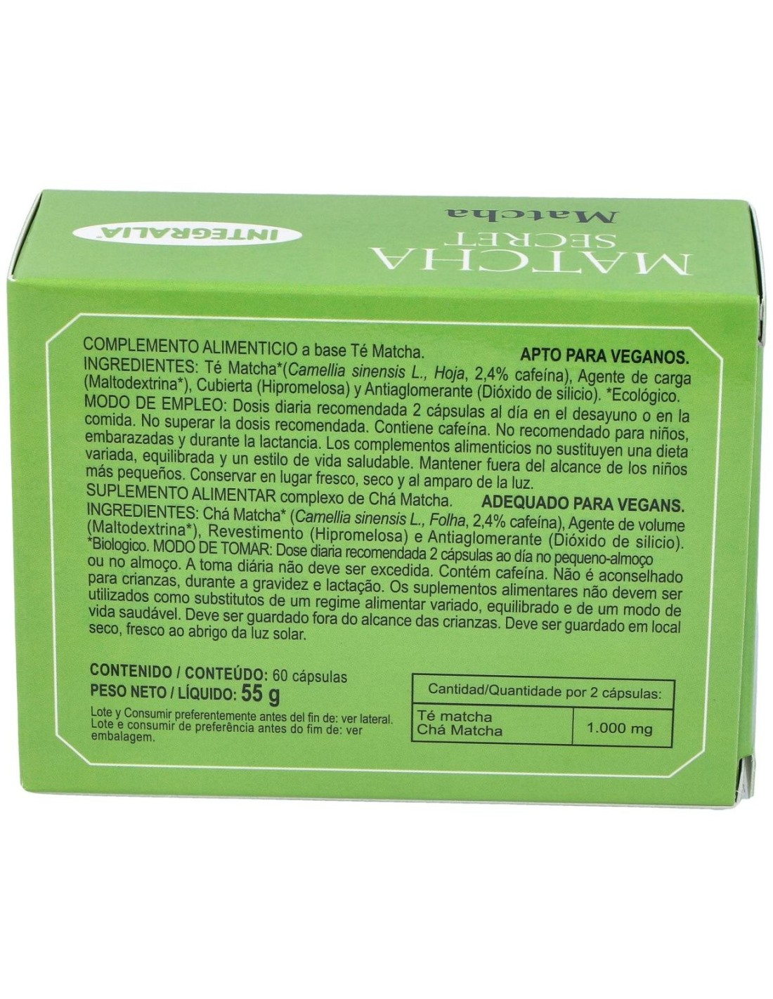 Ingredientes activos por 2 cápsulas:1.000 mg de té matcha ecológico.Modo de empleo:Tomar 2 cápsulas al día en el desayuno o en la comida.Presentación:Envase de 60 cápsulas.