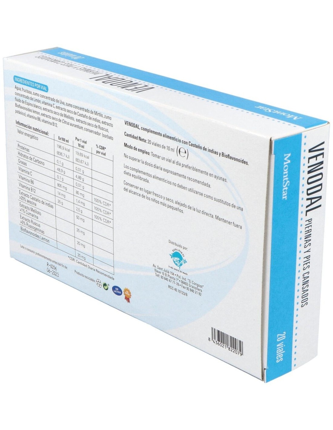 Complemento alimenticio que favorece la circulación periférica. El buen funcionamiento de la circulación es esencial para evitar futuros problemas. Está elaborado con una mezcla de ingredientes a base de castaño de indias, metilato y flavonoides, usados tradicionalmente como tónico venoso, reduciendo la retención de líquidos y la hinchazón. Se han utilizado comúnmente por sus propiedades vaso protectoras, aumenta la resistencia de los capilares, disminuyendo la retención de líquidos en extremidades inferiores. Indicado para piernas y pies cansados.