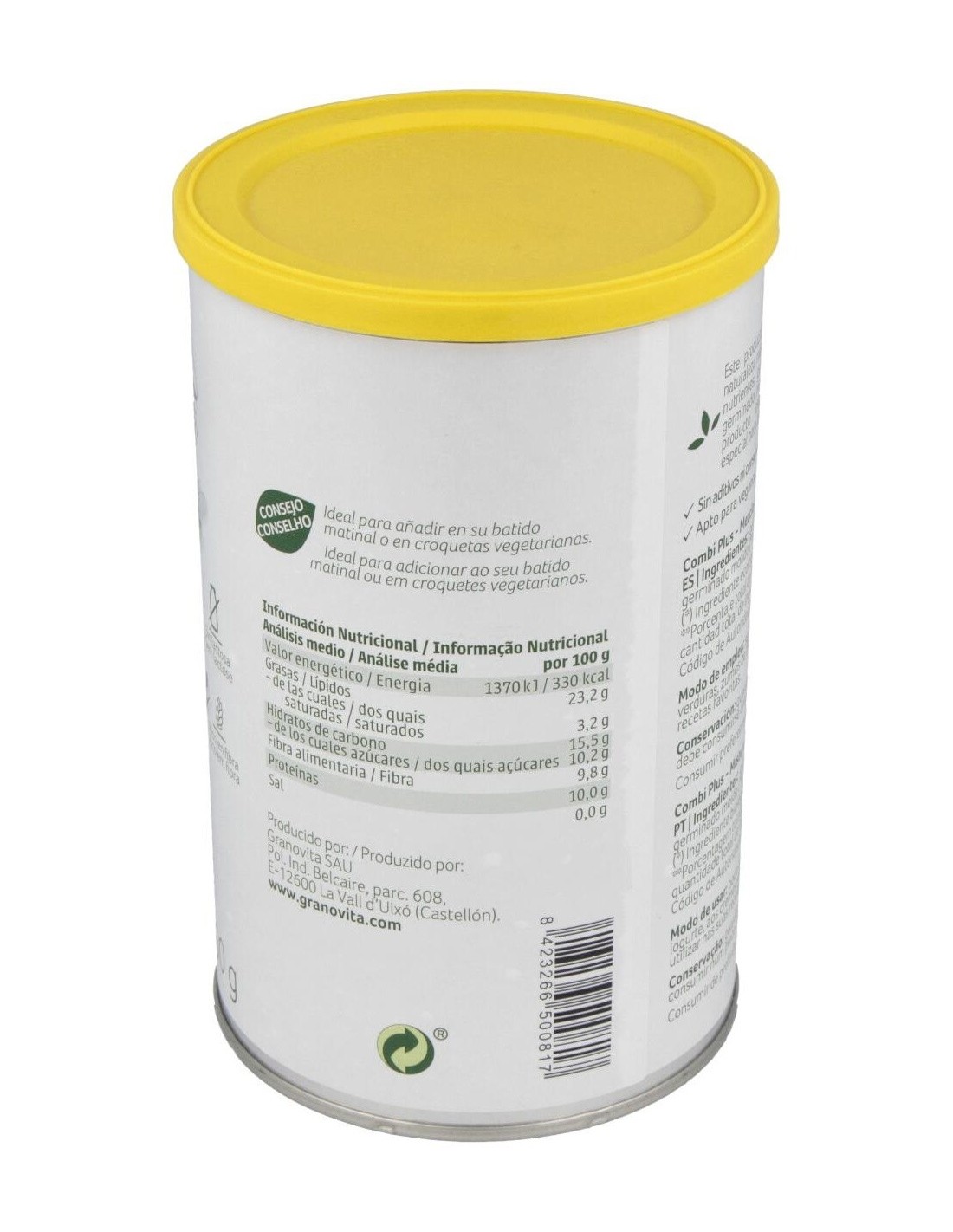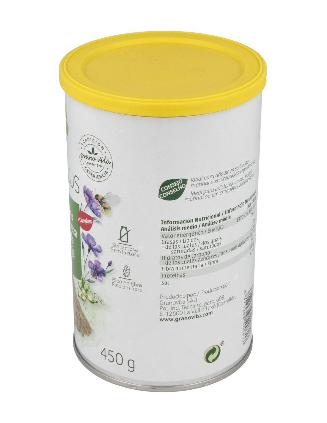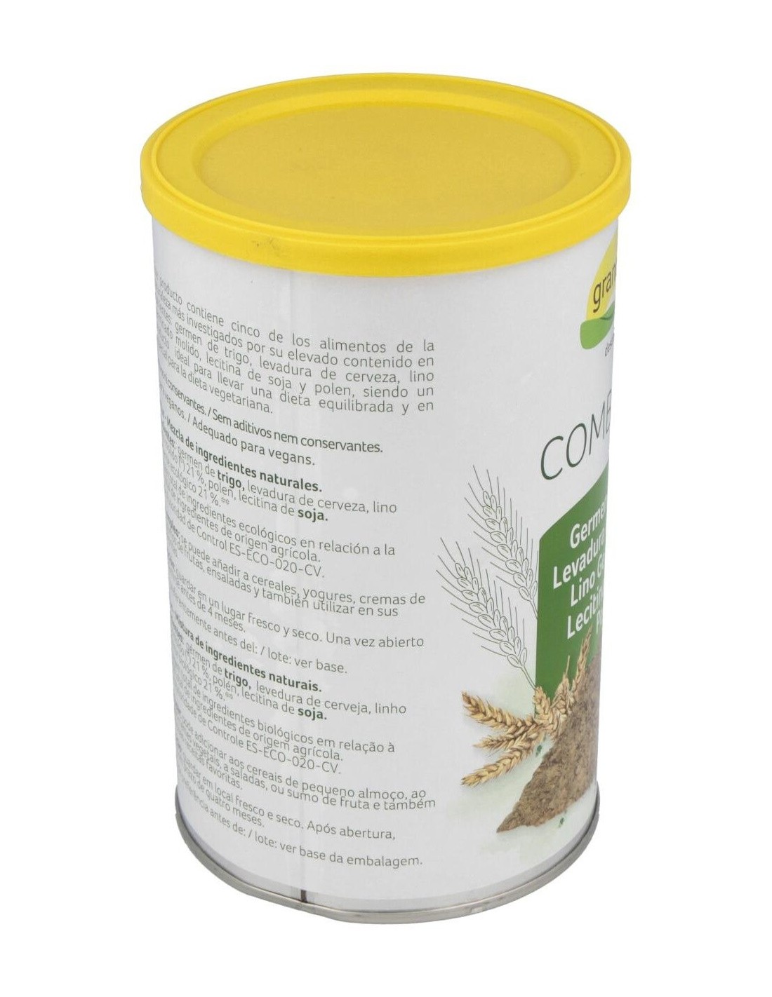 Ingredientes:Germen de trigo, levadura de cerveza, lino germinado molido (*) 21 %, polen, lecitina de soja (*)=de cultivo ecológico.Valor nutricional por 100 gramos: