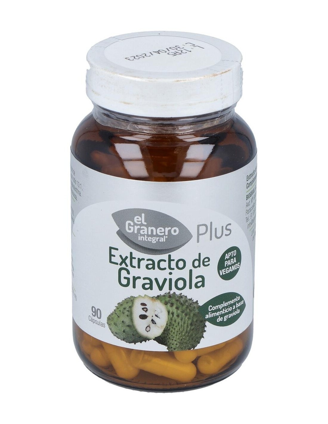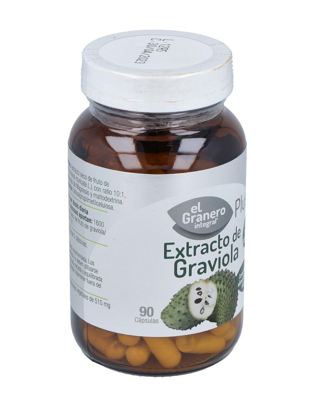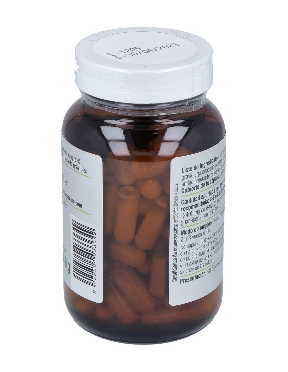 La Graviola es rica en acetogeninas anonáceas, y las hojas se usan en el tratamiento de ciertos tipos de cáncer. En los últimos años se ha extendido ampliamente el uso del extracto de graviola por sus supuestas propiedades antitumorales, que ayudan a combatir distintos tipos de cáncer. Diversos estudios apoyan los efectos anticancerígenos de la anonacina, el compuesto activo de la graviola. Composición:400 mg de extracto seco de fruto de graviola/guanabana (Annona muricata L.) con ratio 10:1. Modo de empleo:Tomar 2 cápsulas de 2 a 3 veces al día antes de las comidas. Presentación:Bote de 90 cápsulas.