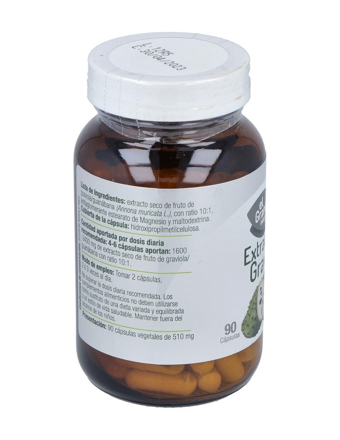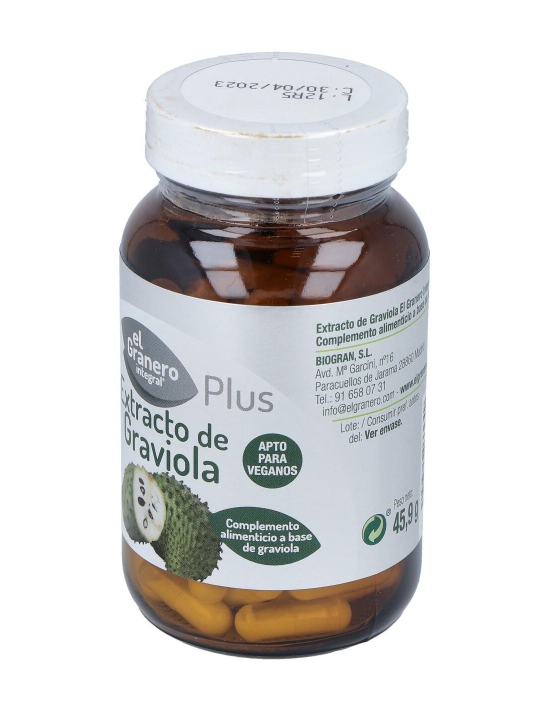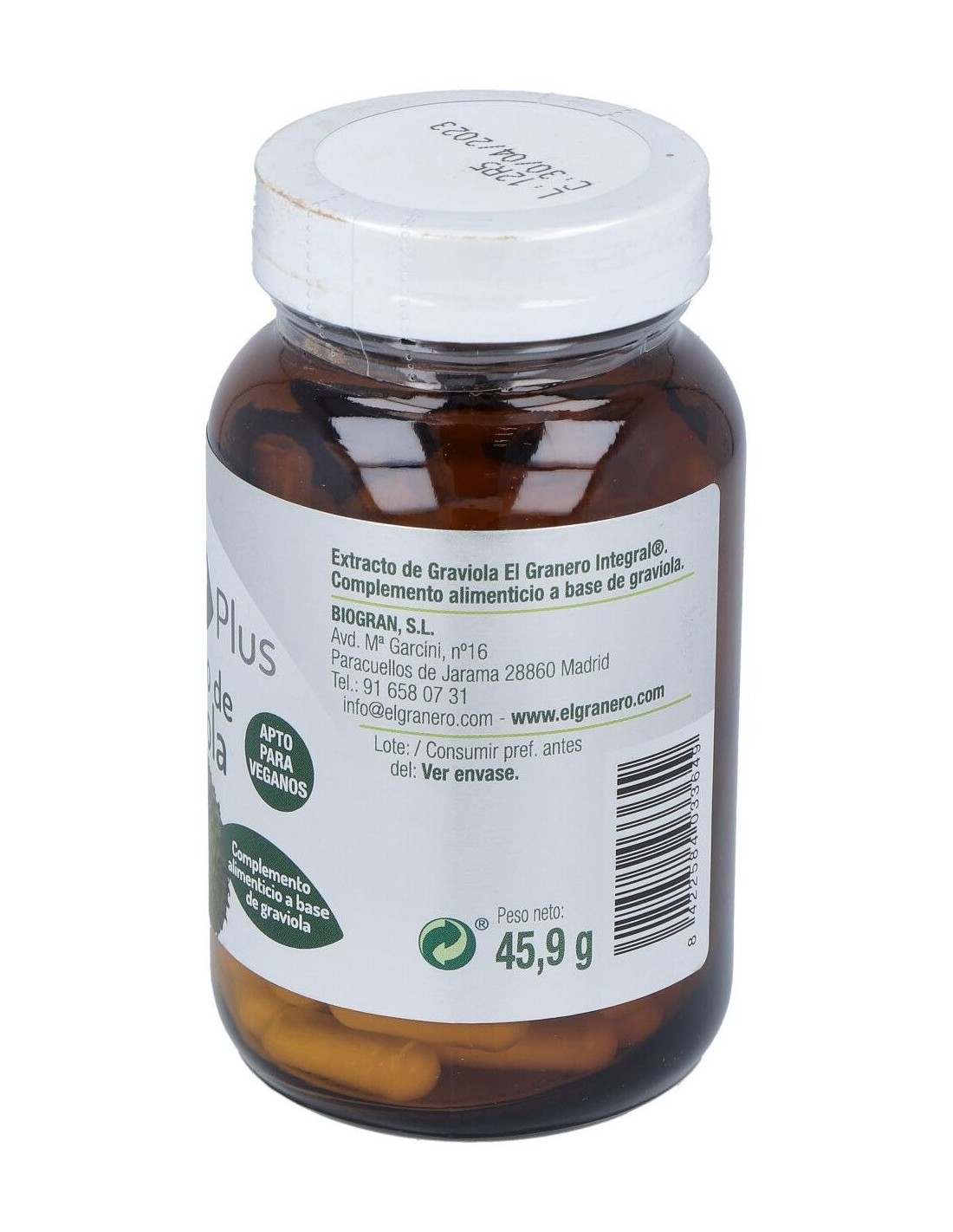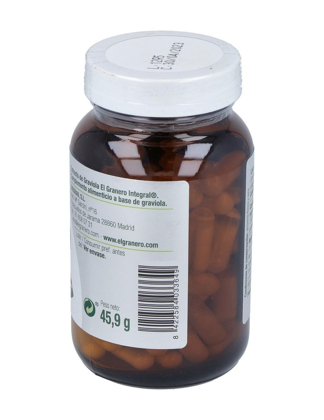 La Graviola es rica en acetogeninas anonáceas, y las hojas se usan en el tratamiento de ciertos tipos de cáncer. En los últimos años se ha extendido ampliamente el uso del extracto de graviola por sus supuestas propiedades antitumorales, que ayudan a combatir distintos tipos de cáncer. Diversos estudios apoyan los efectos anticancerígenos de la anonacina, el compuesto activo de la graviola. Composición:400 mg de extracto seco de fruto de graviola/guanabana (Annona muricata L.) con ratio 10:1. Modo de empleo:Tomar 2 cápsulas de 2 a 3 veces al día antes de las comidas. Presentación:Bote de 90 cápsulas.